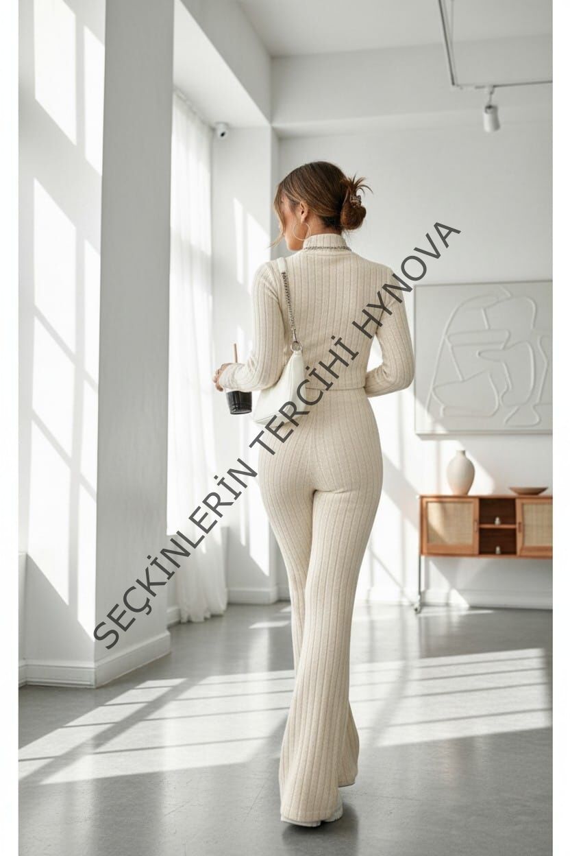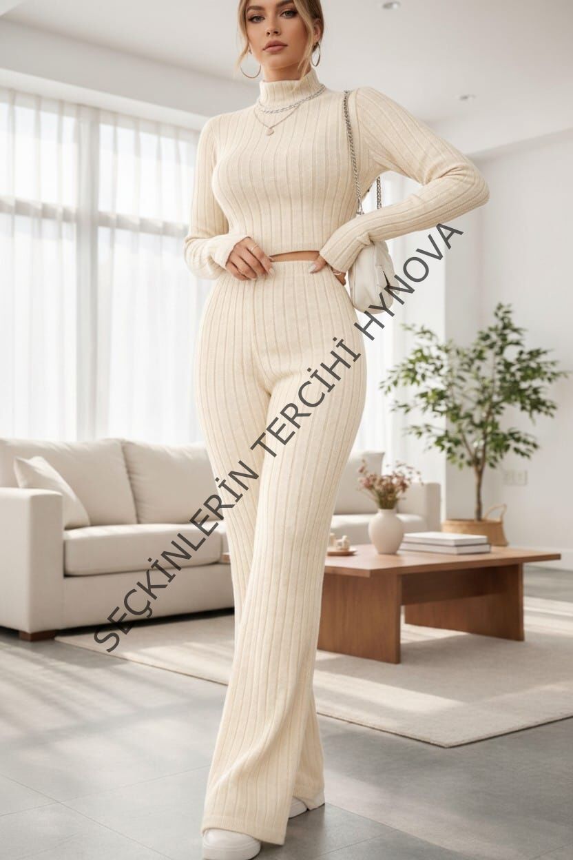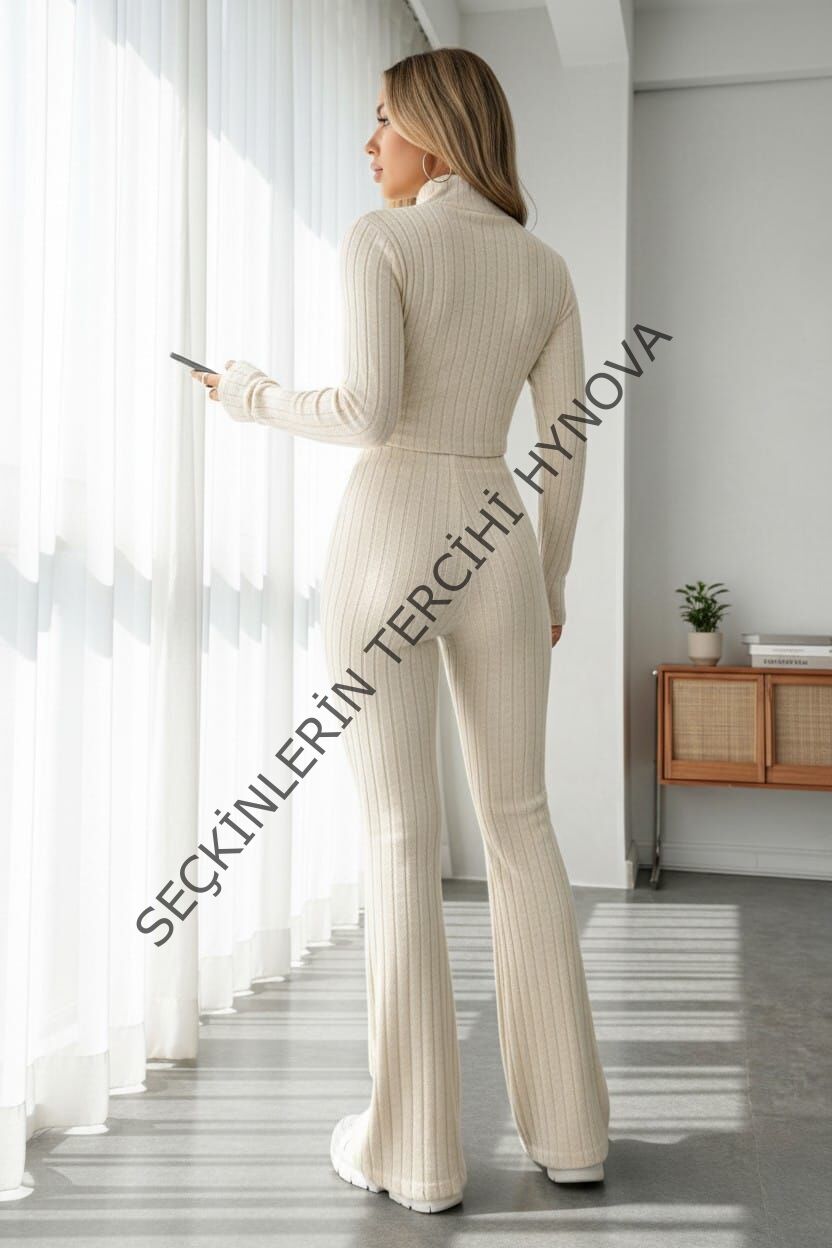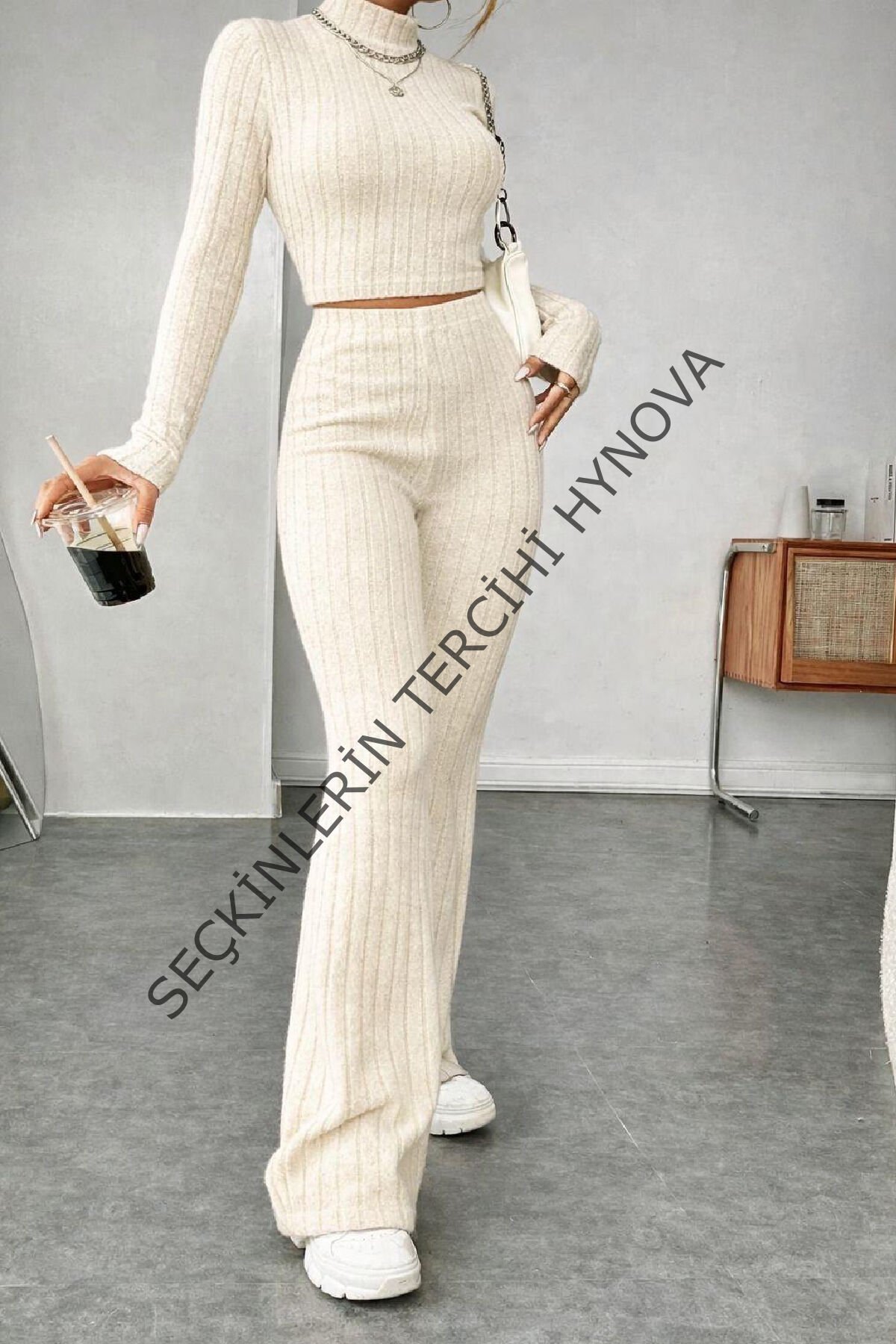 Kadın Ekru Çizgili Boğazlı Crop Top ve Yüksek Bel Eşofman Takımı Spor Şık Kombin