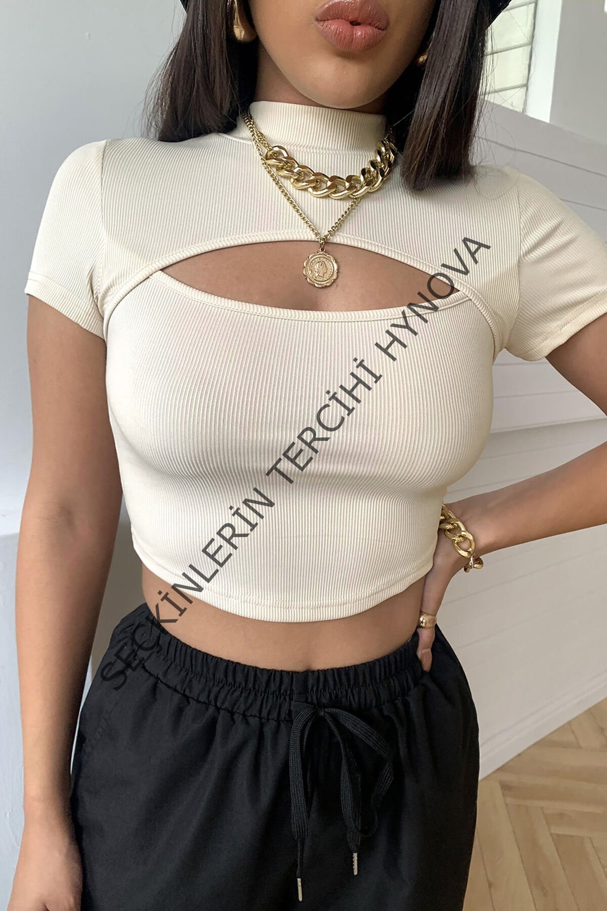 Kadın Ekru Göğüs Dekolteli Yarım Kollu Cut Out Crop Top Bluz – Şık, Rahat ve Kolay Kombinlenebilir