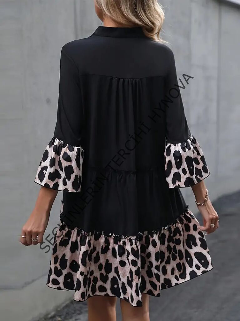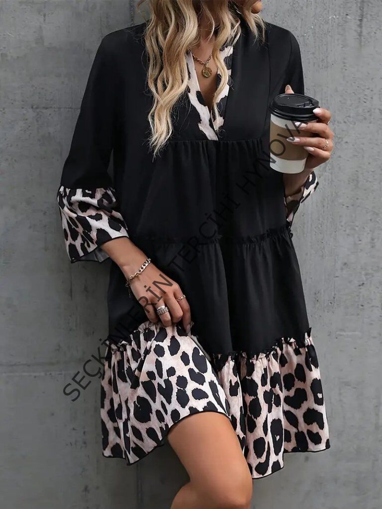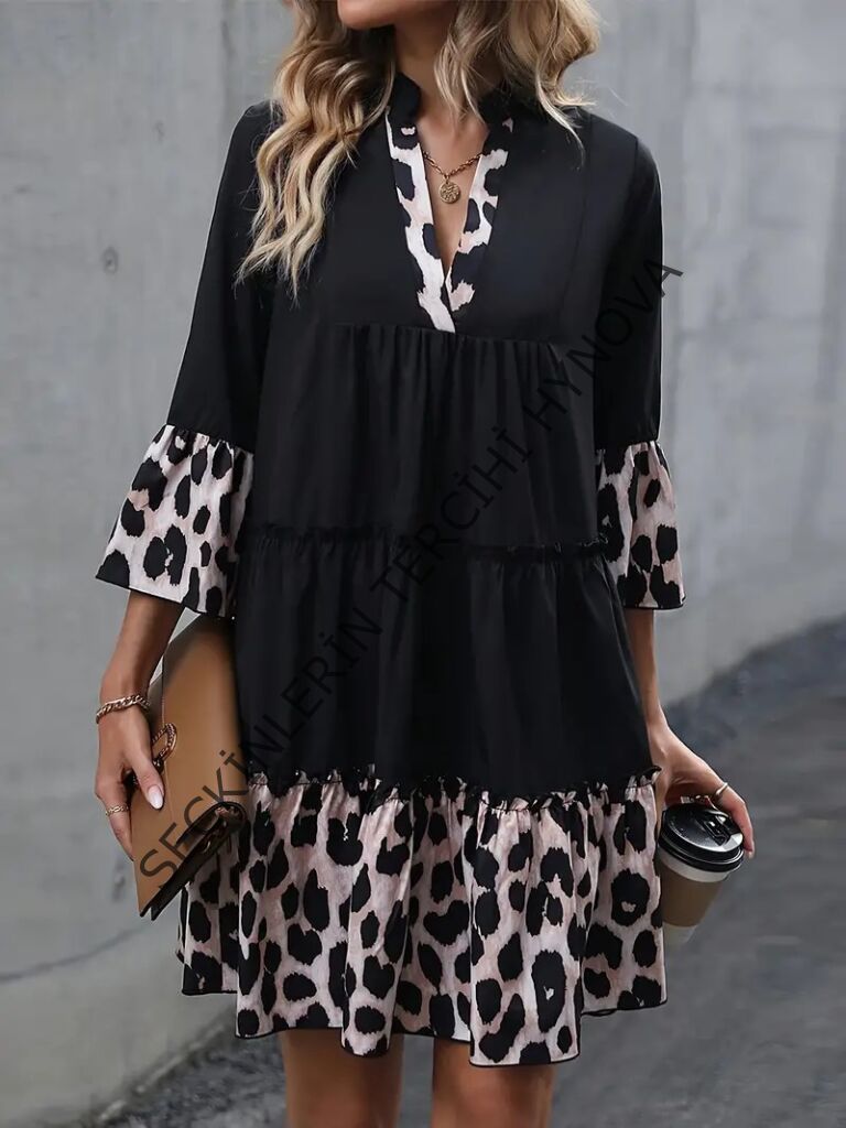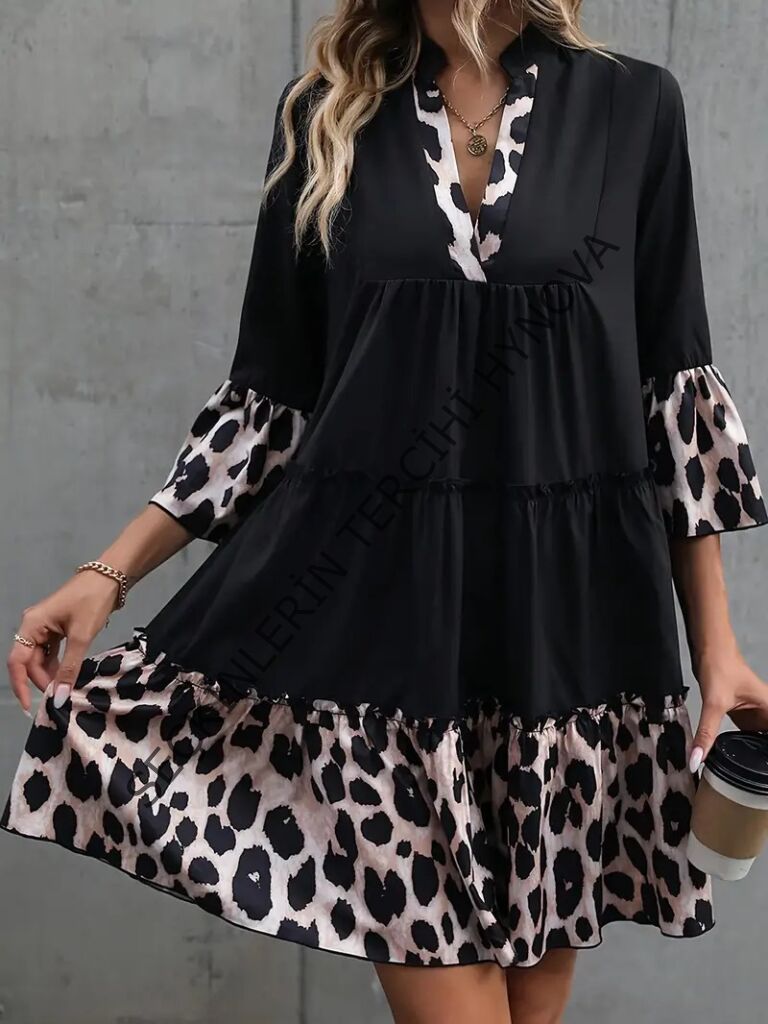 Kadın Fakir Kol V Yakalı Leopar Desen Detaylı Trikoton Elbise