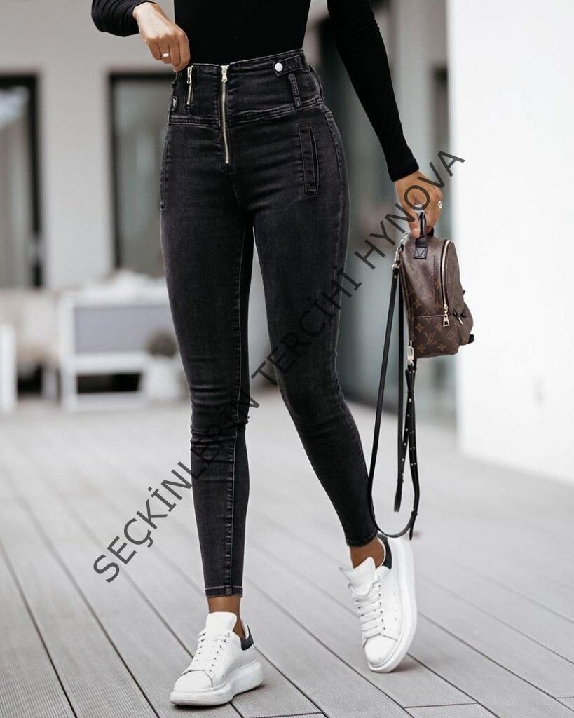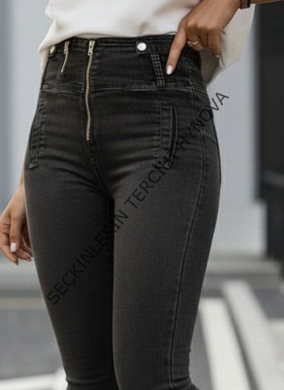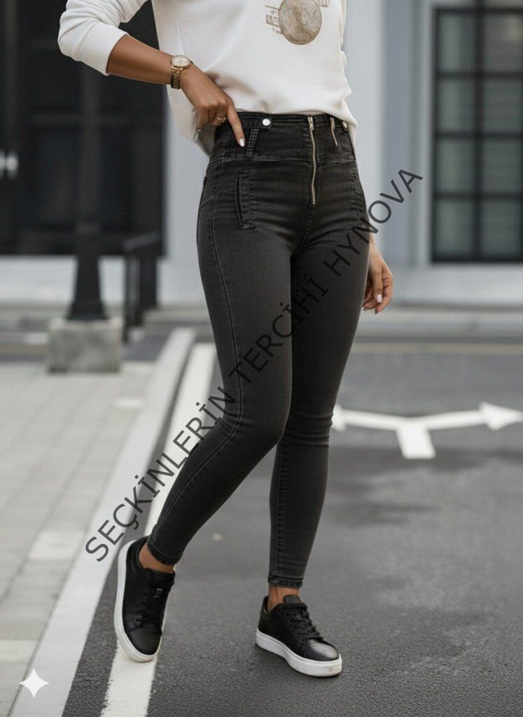 Kadın Fermuar Detay Yüksek Kemerli Kot Pantolon