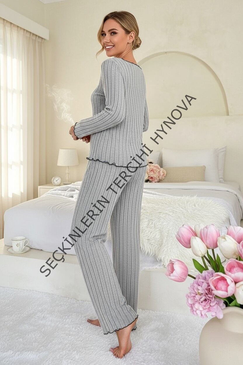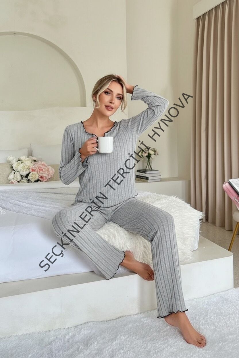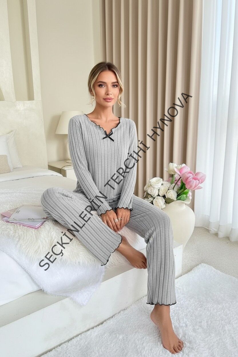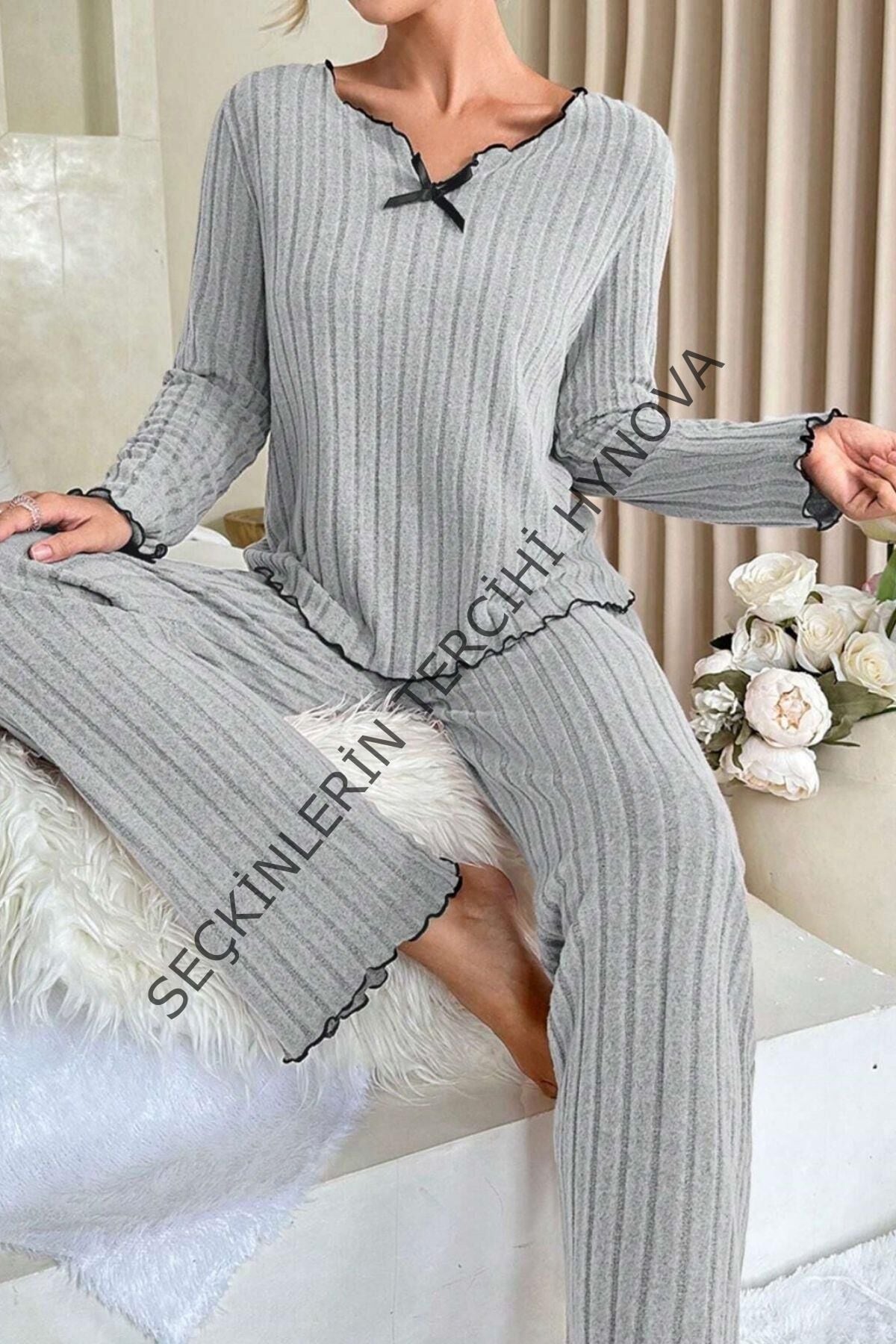 Kadın Gri Çizgili Uzun Kollu Fiyonk Detaylı Pijama Takımı Rahat Mevsimlik