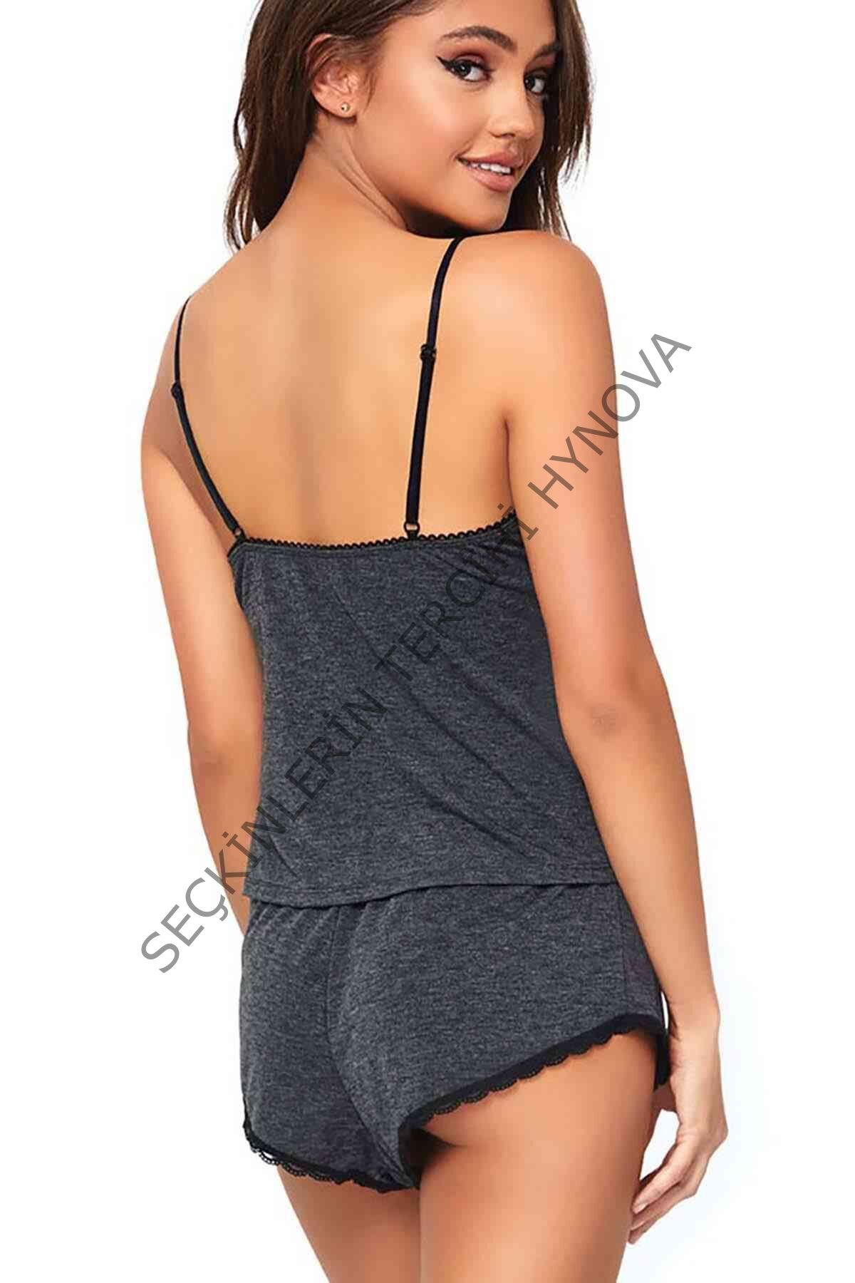 Kadın Gri Dantel Işlemeli Şortlu Gecelik Takımı – Modern, Konforlu ve Günlük Kombinlere Uygun