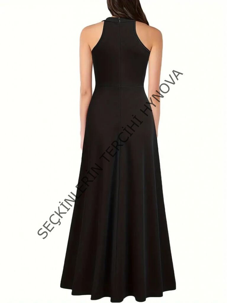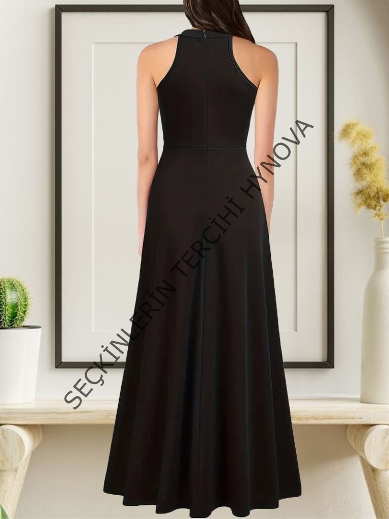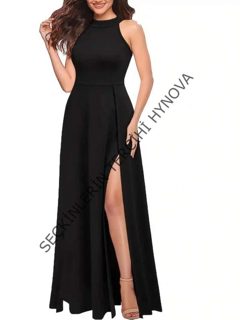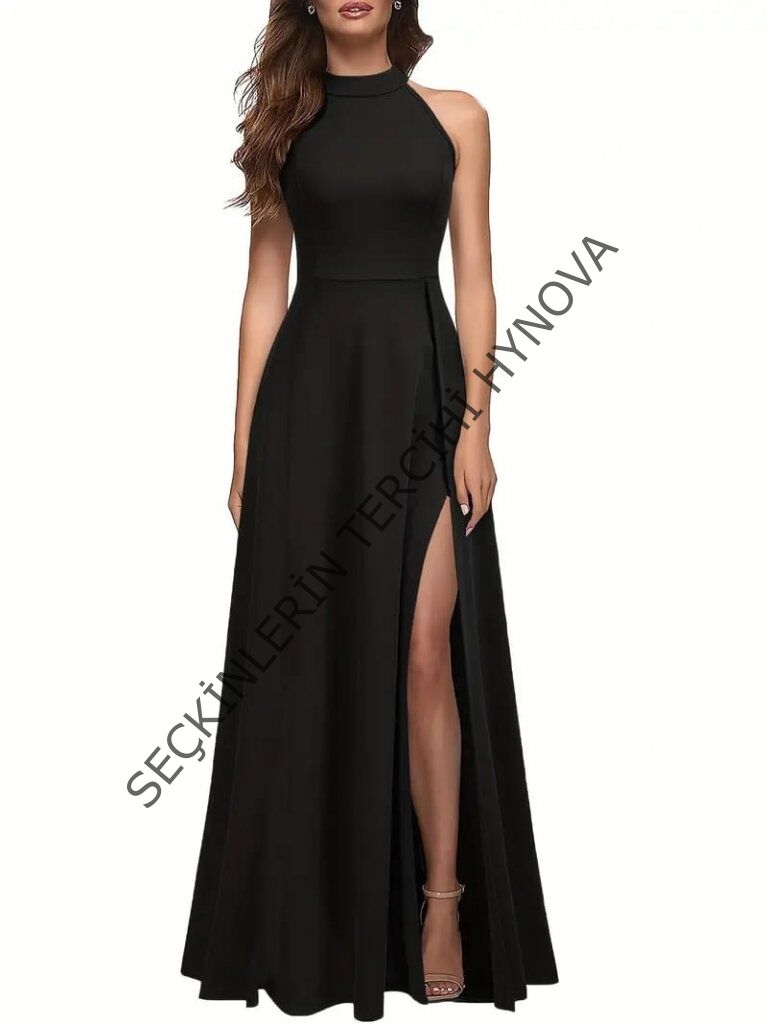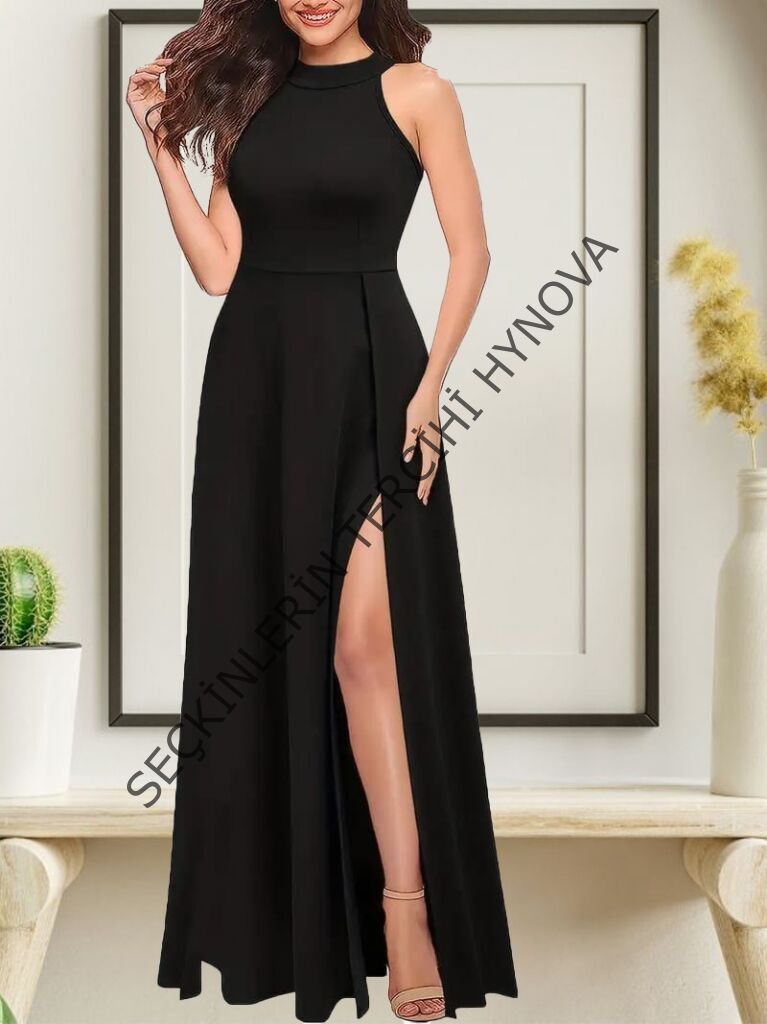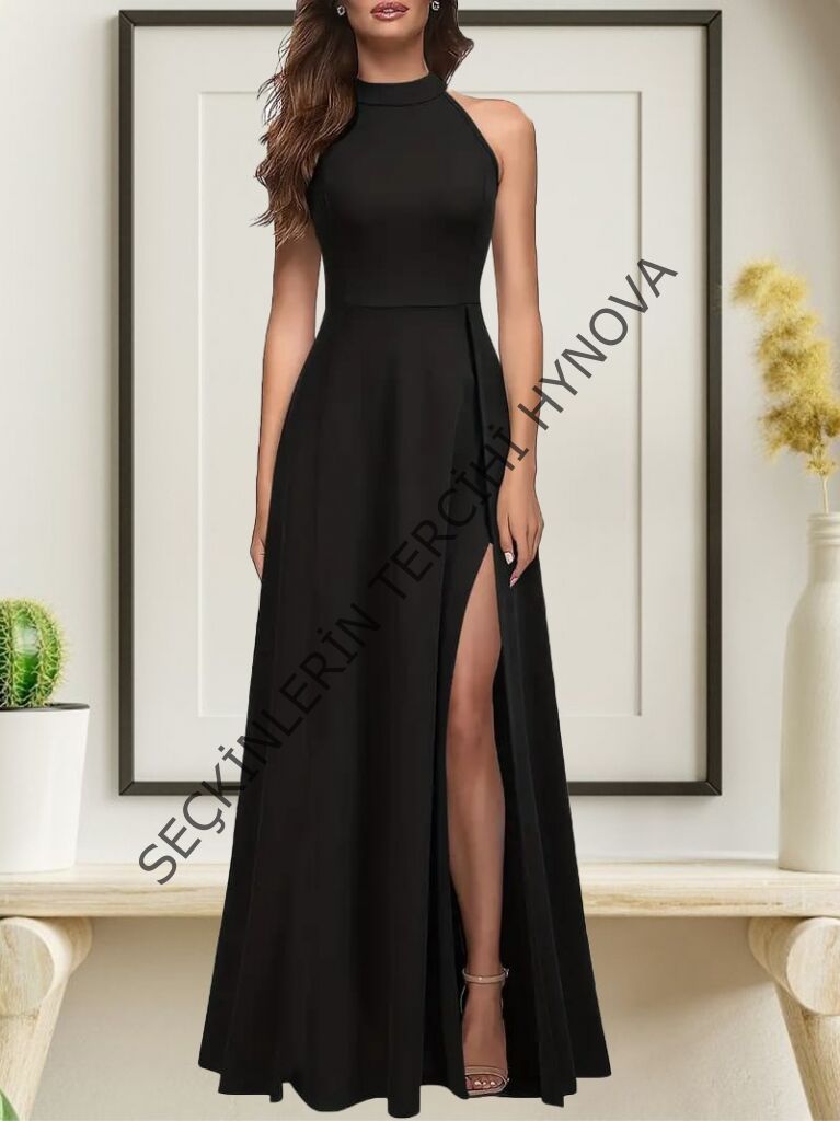 Kadın Halter Yaka Derin Yırtmaç Detaylı Tam Boy Ithal Krep Abiye Elbise