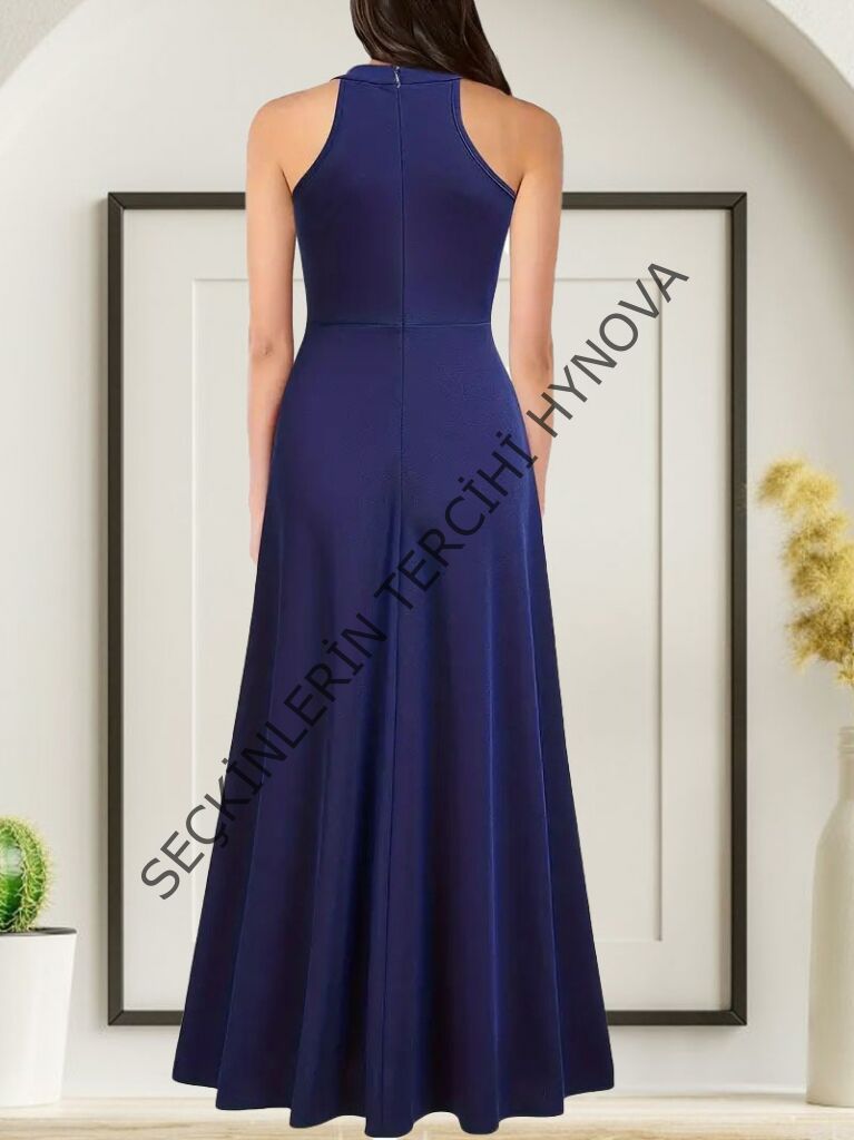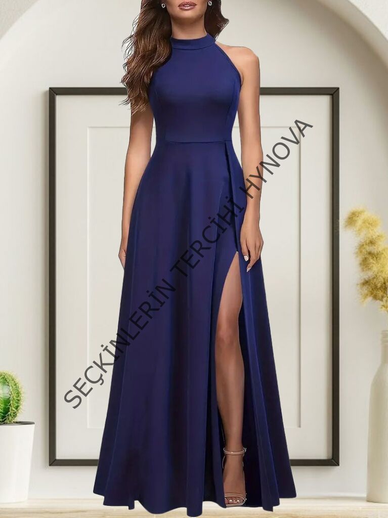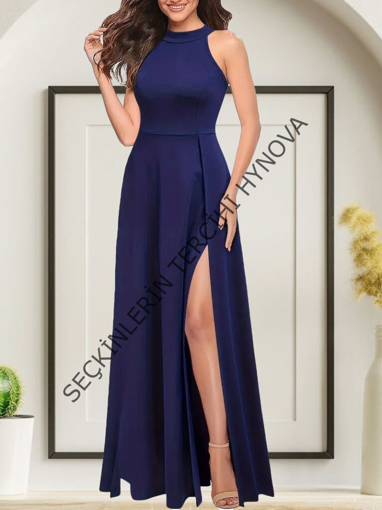 Kadın Halter Yaka Derin Yırtmaç Detaylı Tam Boy Janjan Krep Abiye Elbise