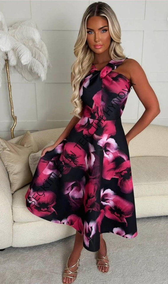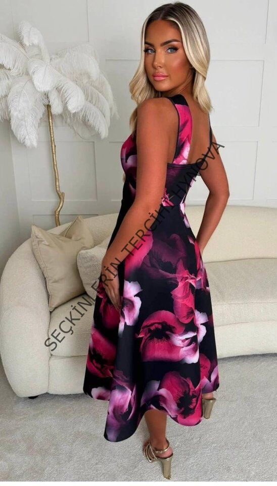 Kadın Halter Yaka Detay Ciçek Baskılı Midi Boy Elbise