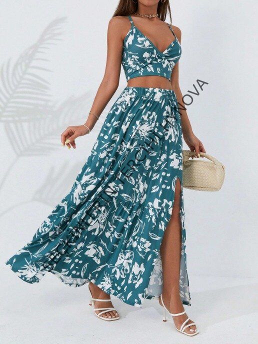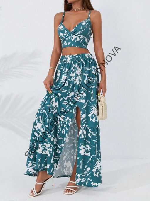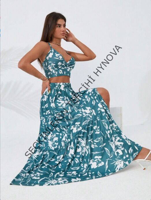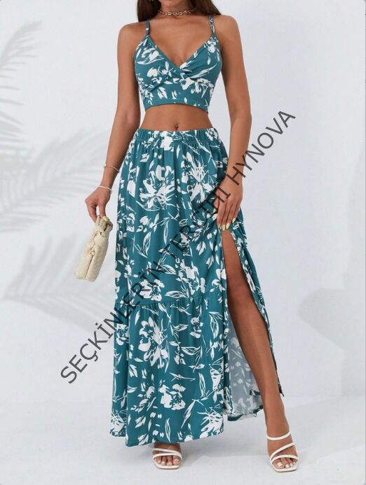Kadın Ince Askılı çiçek Baskı Desenli Crop Yırtmaçlı Etek Ikili Süprem Takım