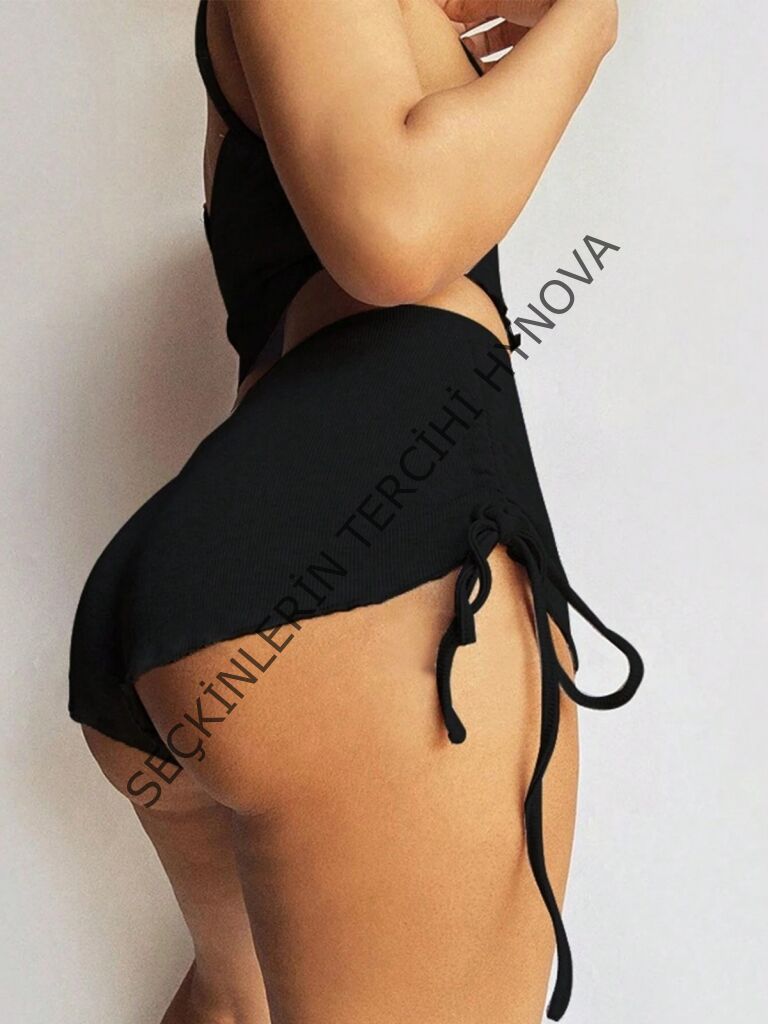 Kadın Ip Askılı Crop Bluz Ve Yanlardan Büzgülü Ikili Kaşkorse Short Takım