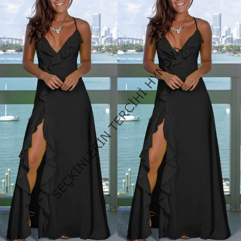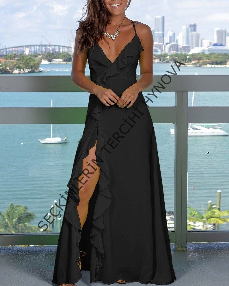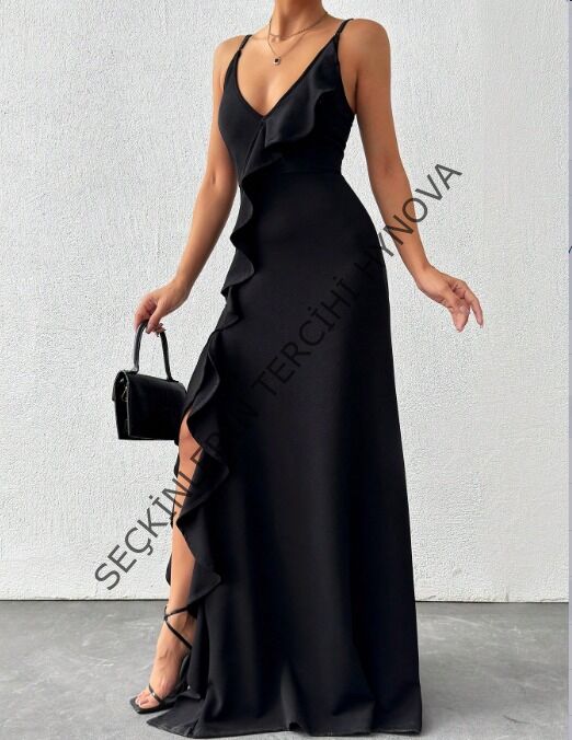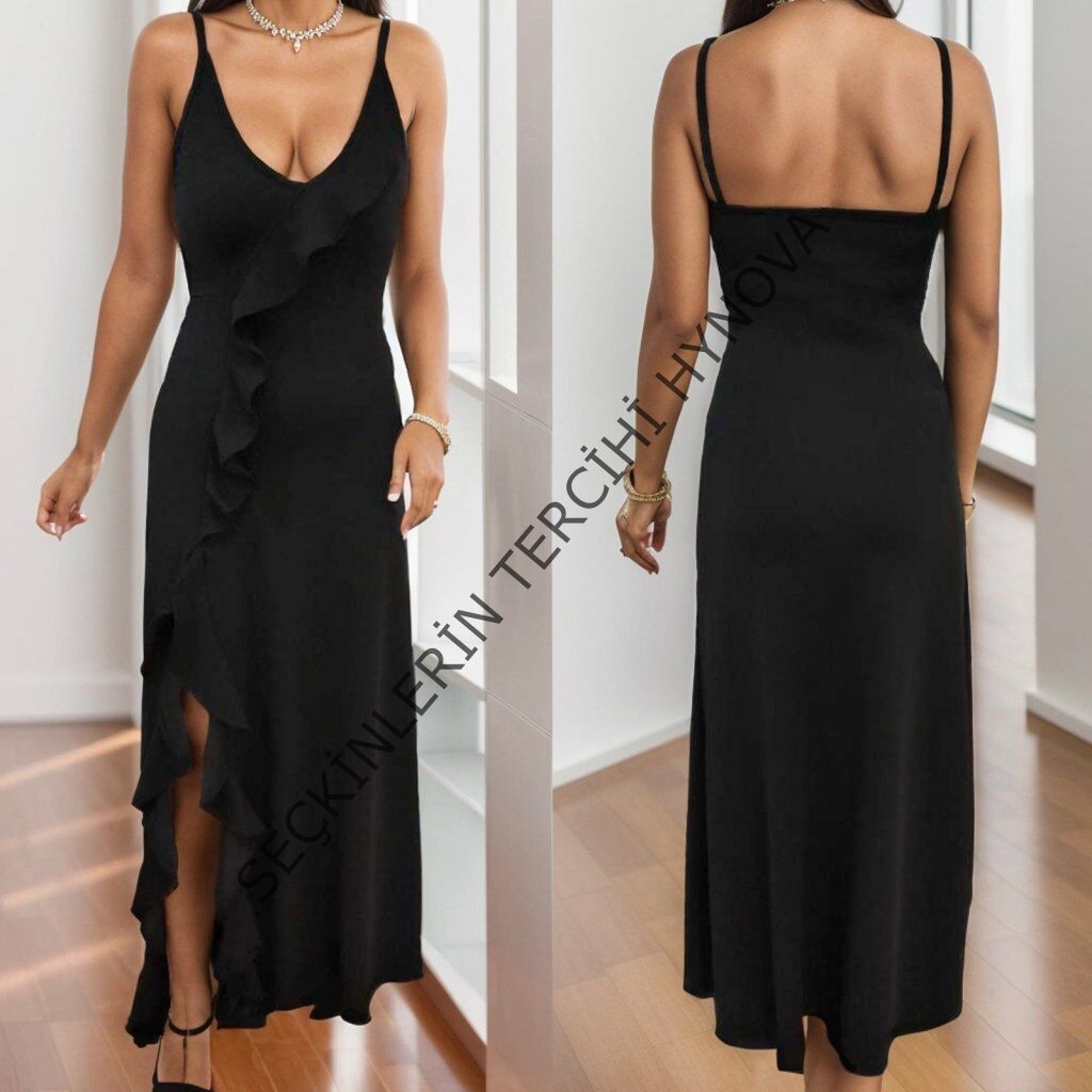 Kadın Ip Askılı Dekolteli Yırtmaç Detay Krep Elbise