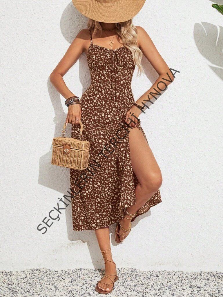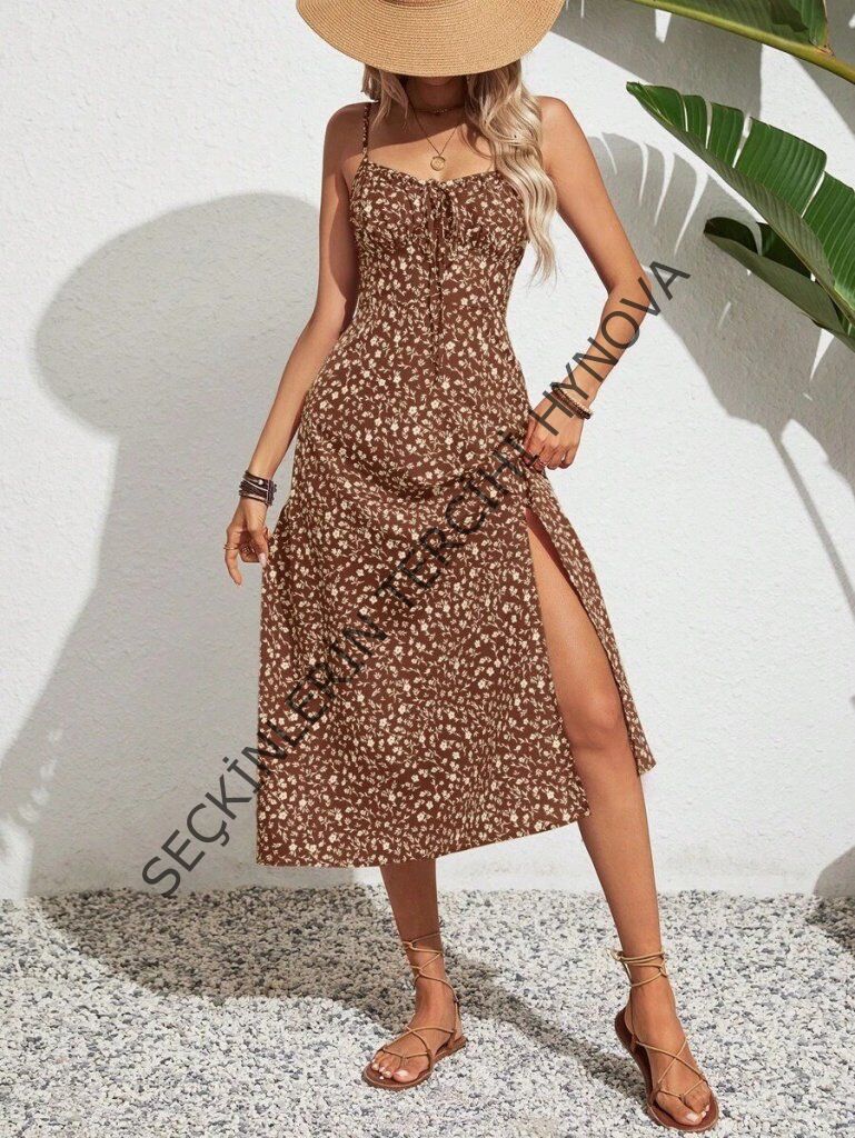 Kadın Ip Askılı Geniş V Yaka Bağcıklı Yandan Yırtmaçlı çiçek Desenli Midi Süprem Elbise