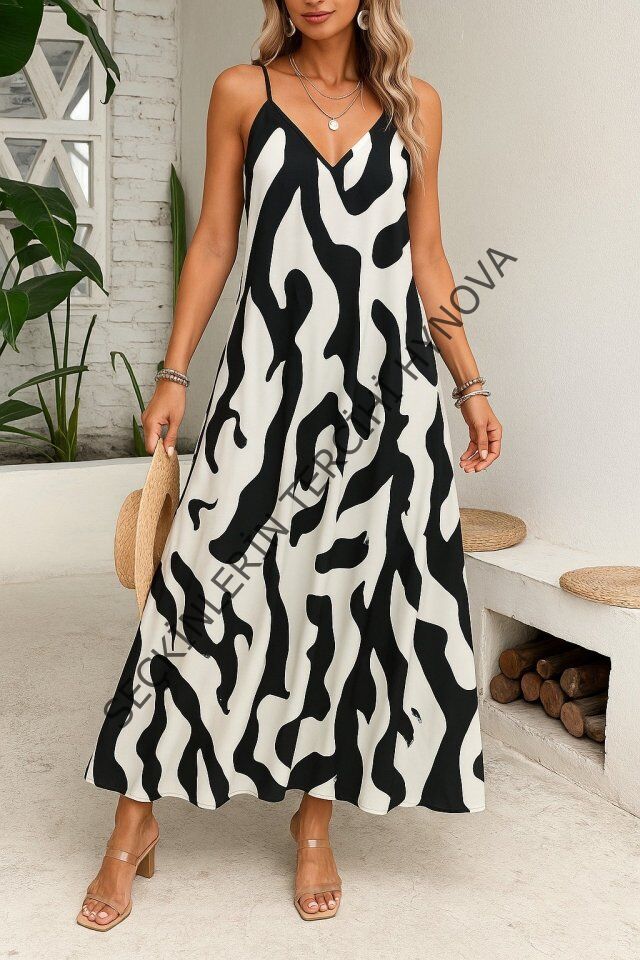 Kadın Ip Askılı Geniş V Yakalı Leopar Desenli Süprem Elbise