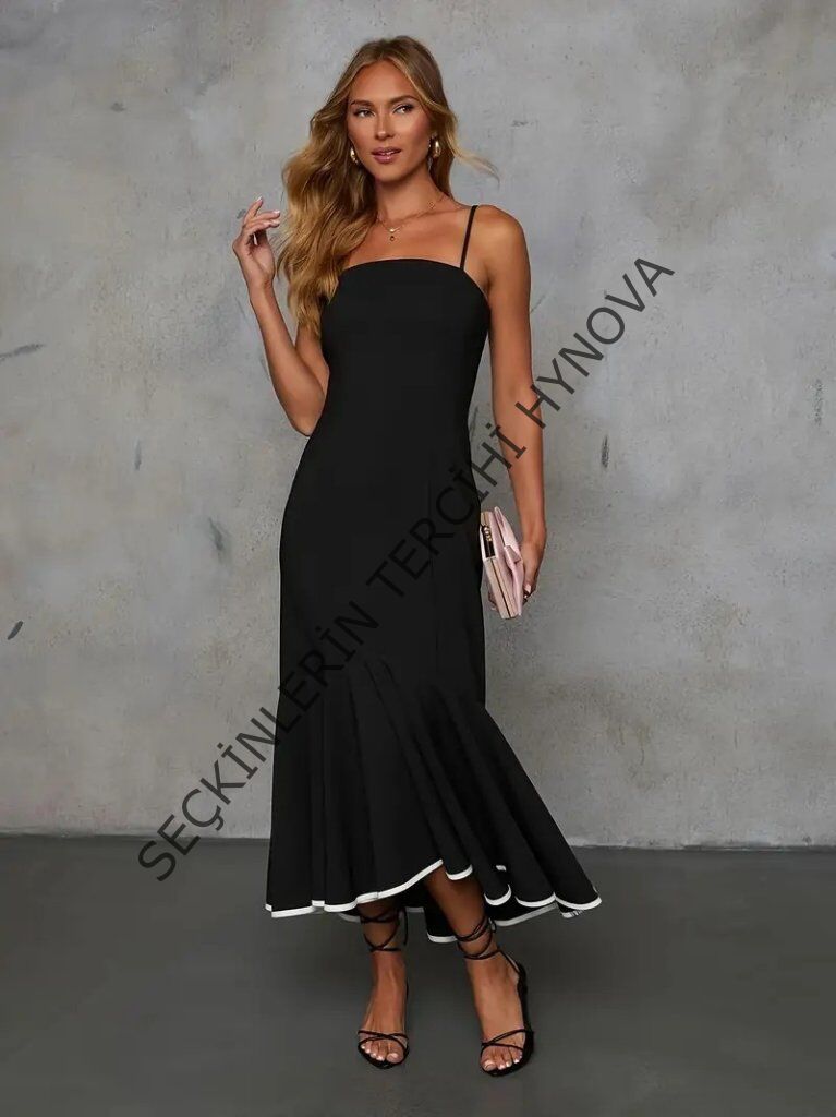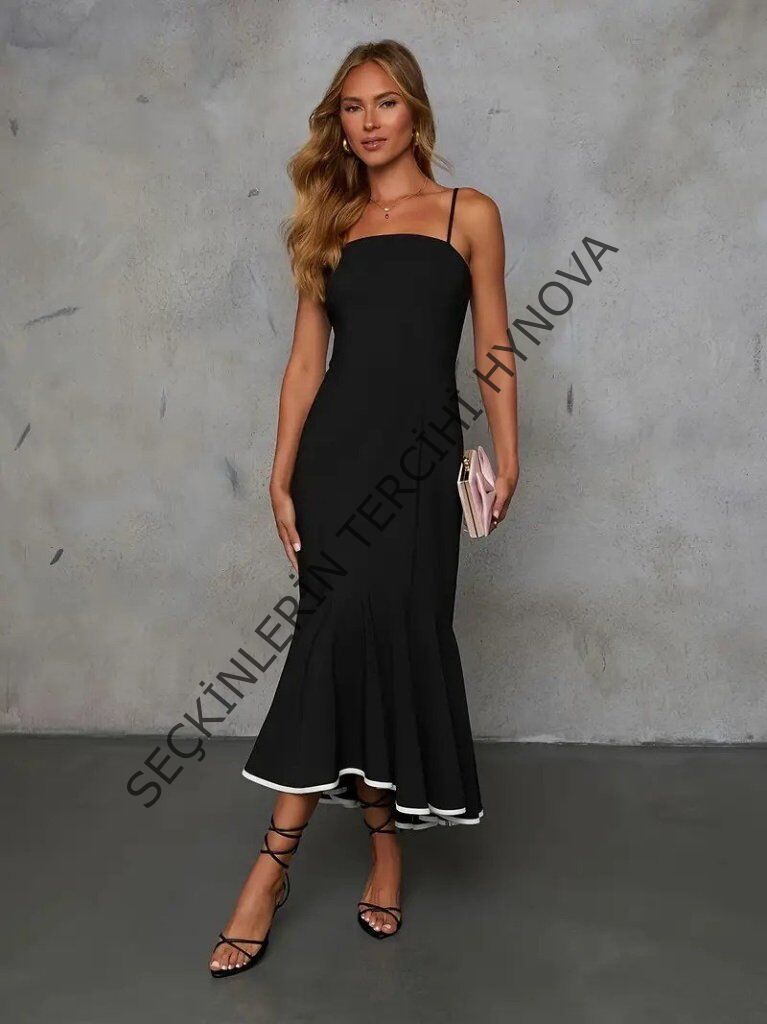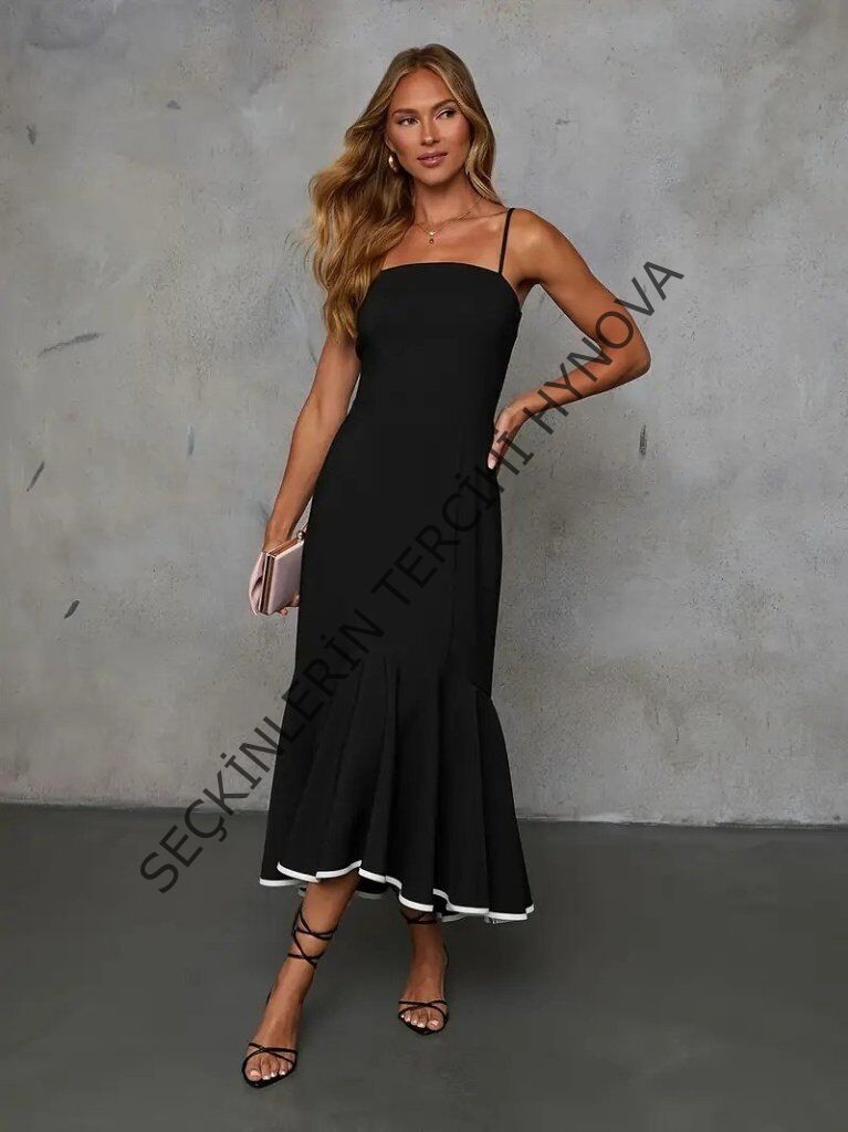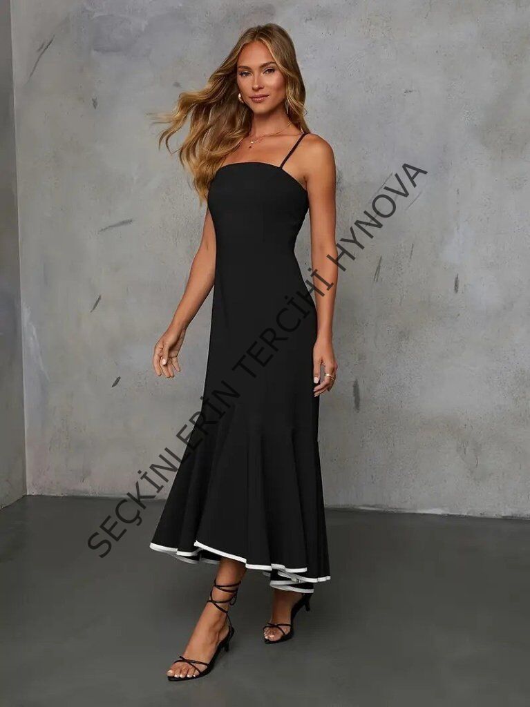 Kadın Ip Askılı Straplez Kesim Detay Maksi Boy Janjan Krep Elbise