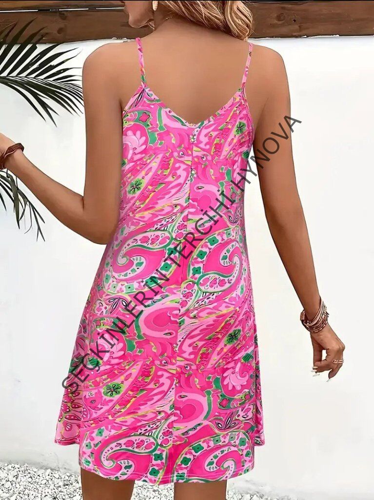 Kadın Ip Askılı V Yakalı Desenli Kısa Süprem Mini Elbise