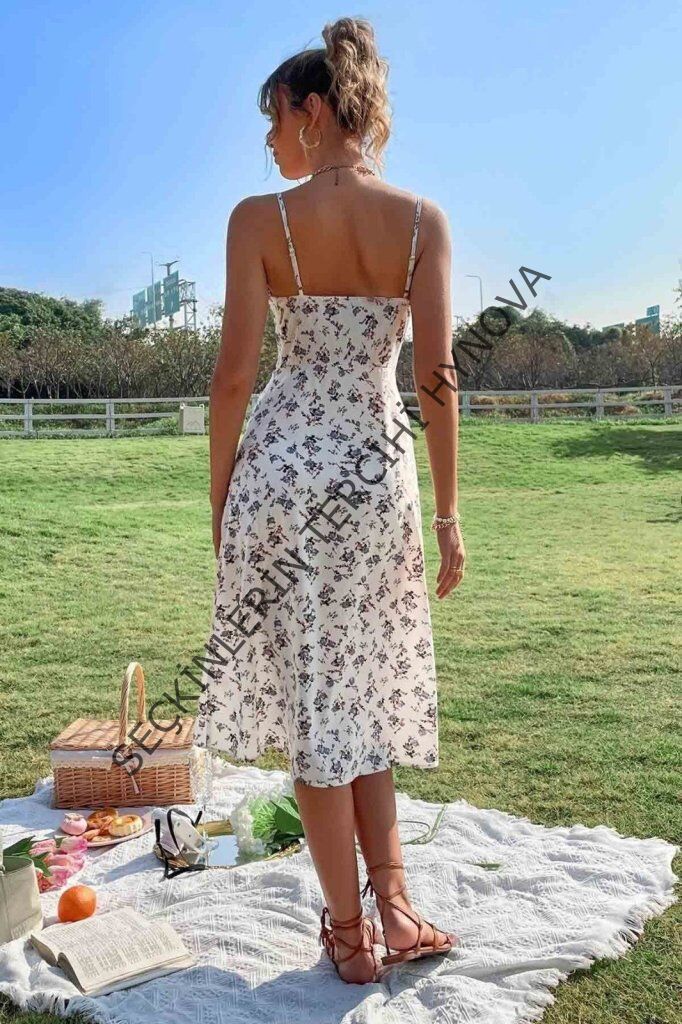 Kadın Ip Askılı Yakadan Bağcıklı Desenli Süprem Elbise