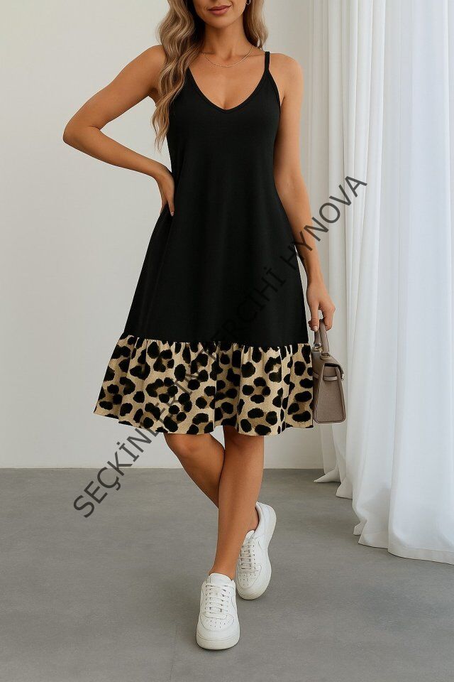 Kadın Ip Detaylı Kısa Elbise Askılı Yuvarlak Yakalı Viskon Etek Süprem Elbise