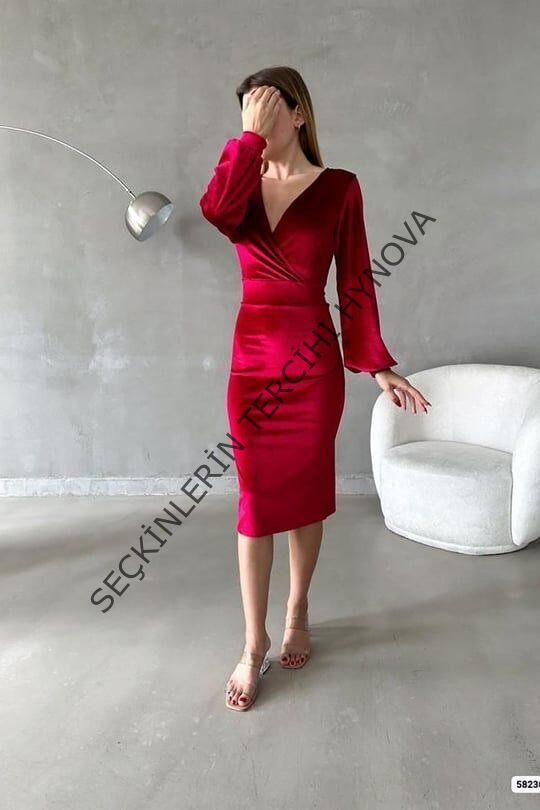 Kadın Kadife Kumaş Kruvaze Yaka Balon Kol Ve Yırtmaç Detaylı Midi Boy Elbise