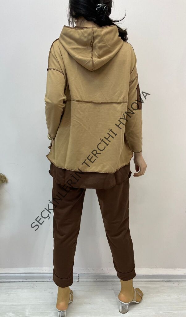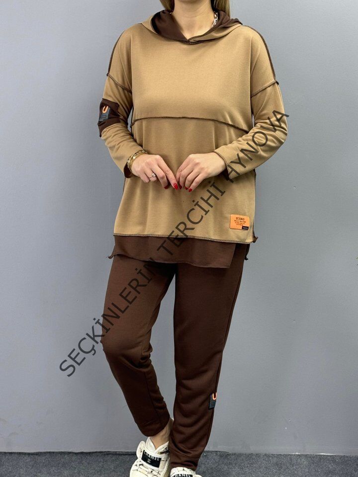 Kadın Kahve Kapşonlu Etek Ucu Detay Arma Ters Dikiş Gorunumlu Ikili Takım