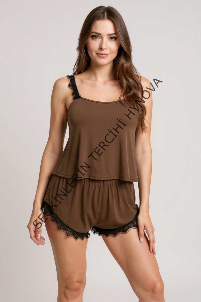 Kadın Kahverengi Dantelli Şortlu Pijama Takımı – Rahat, Şık ve 4 Mevsim Kullanım