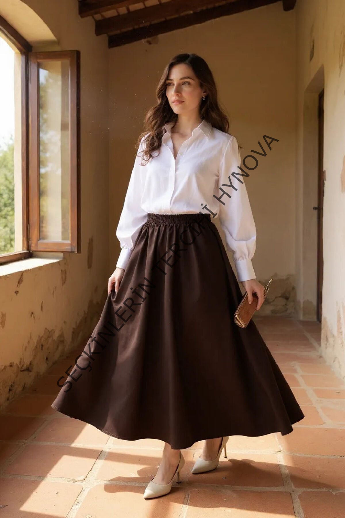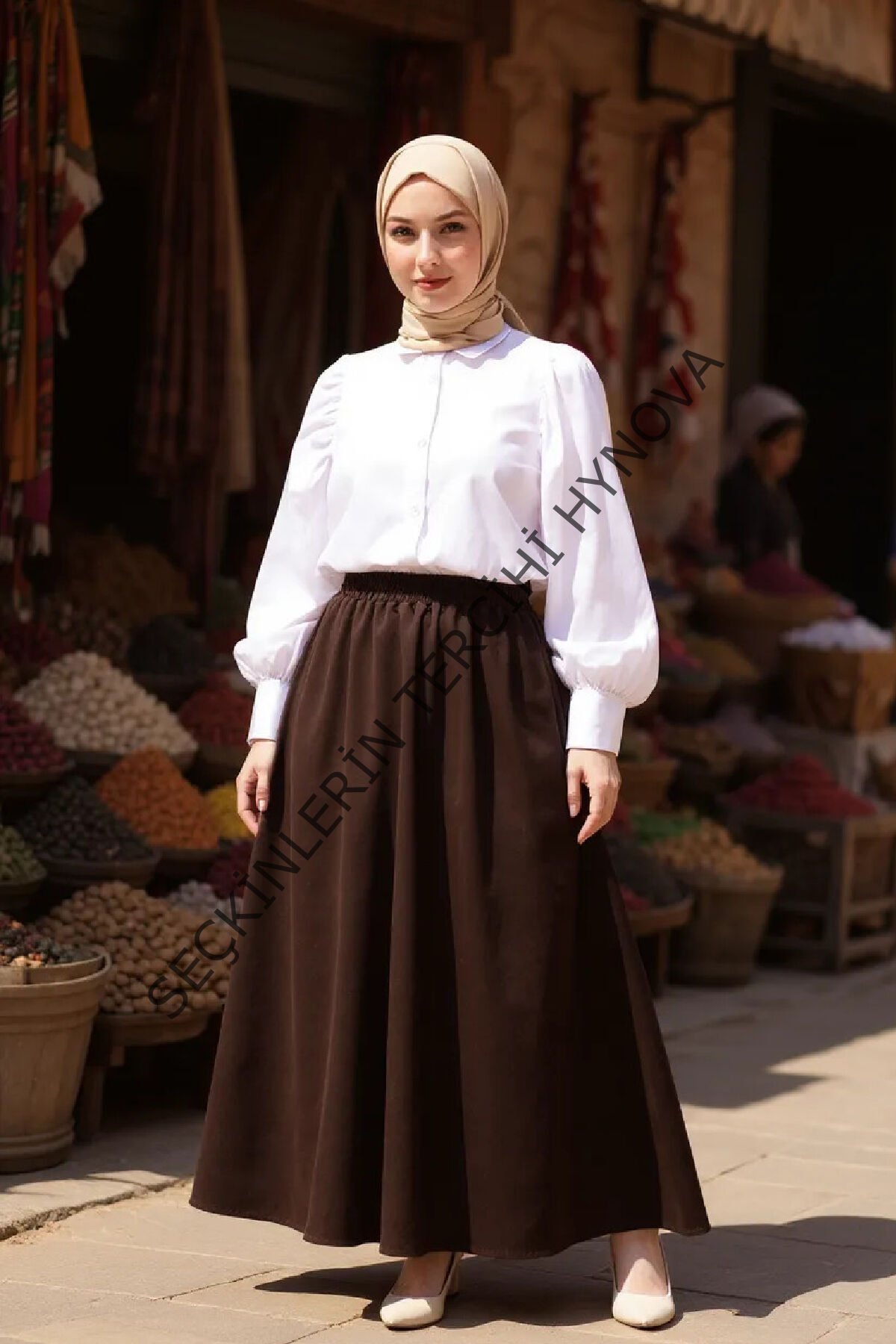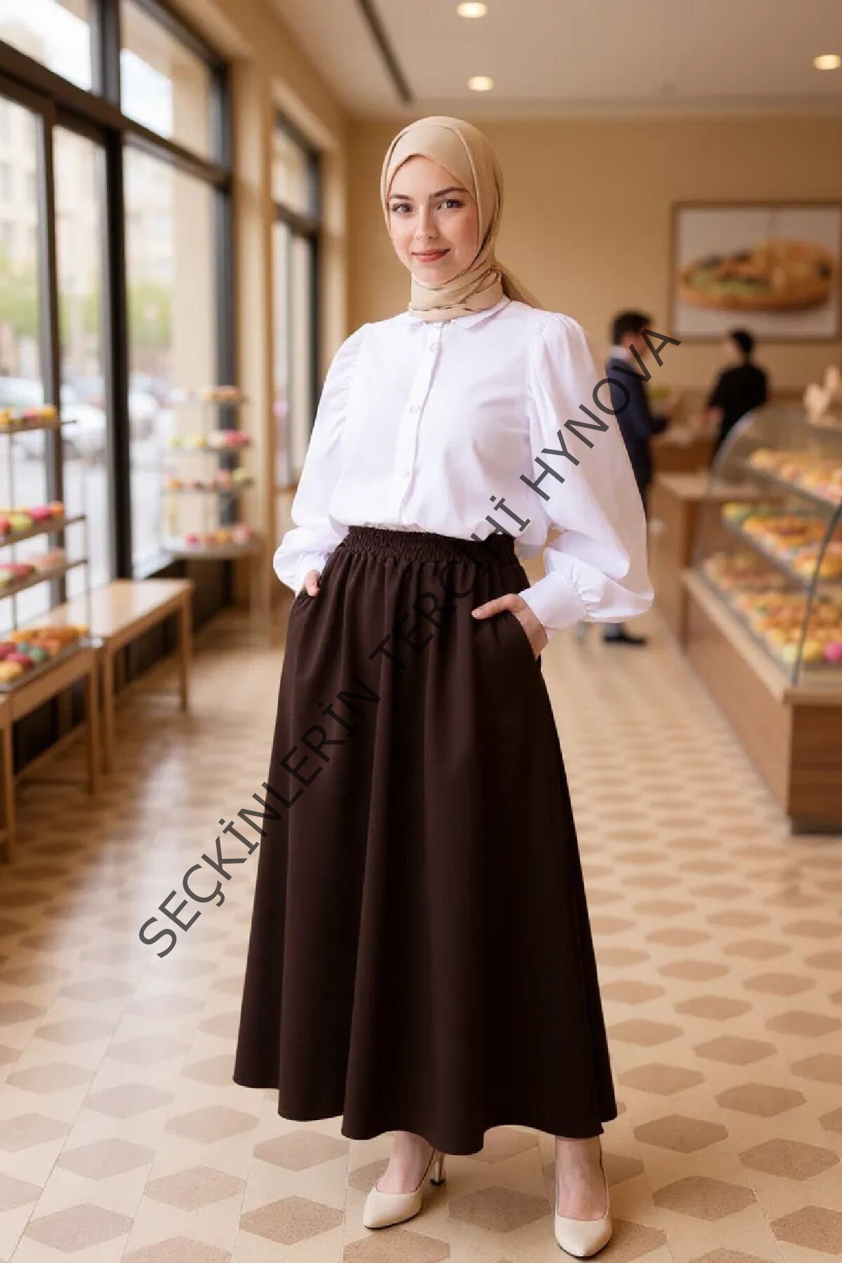 Kadın Kahverengi Double Kumaş Beli Lastikli Cepli Etek