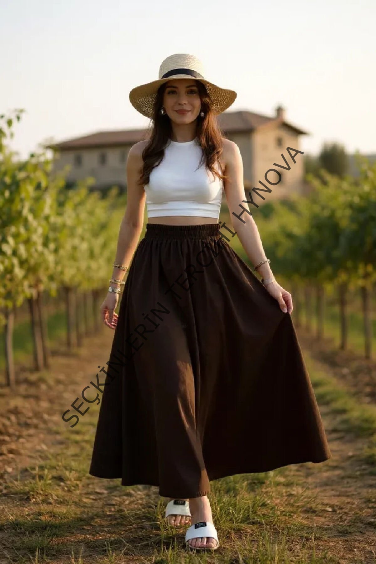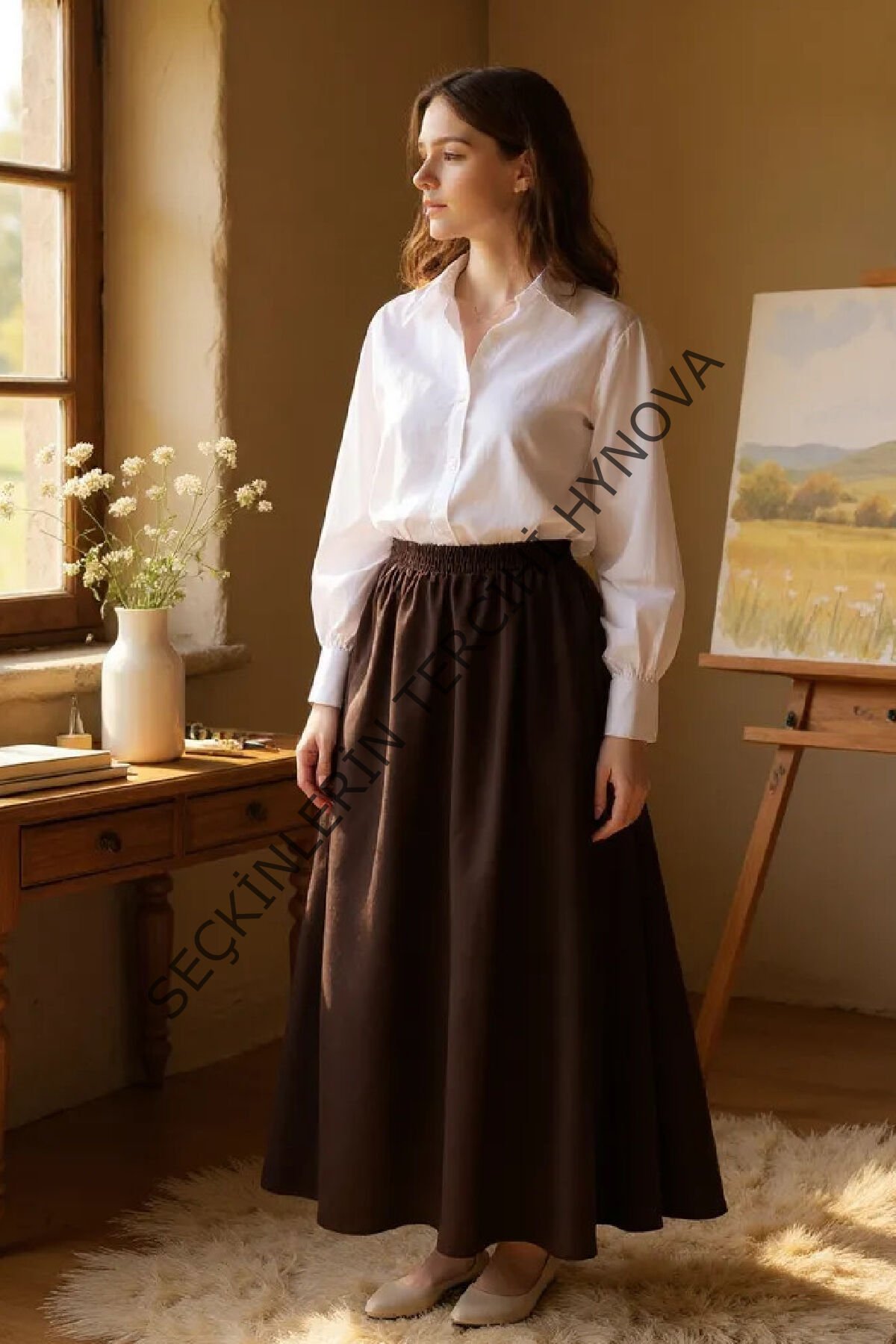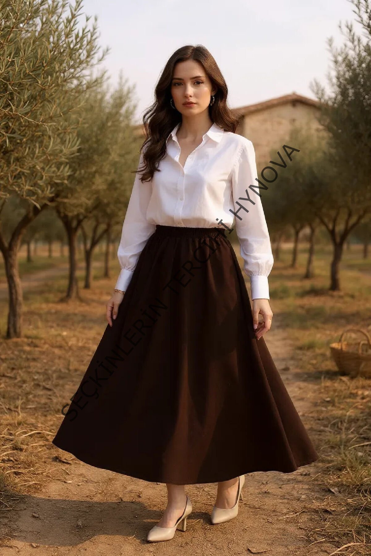 Kadın Kahverengi Double Kumaş Beli Lastikli Cepli Etek