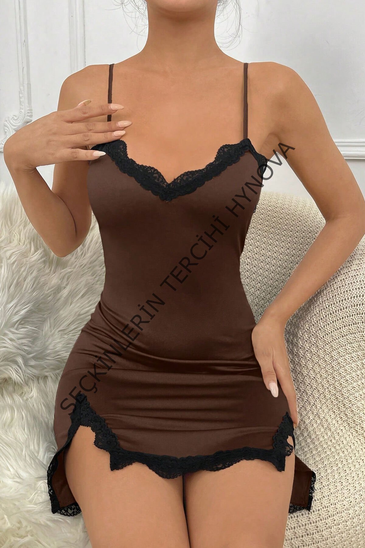 Kadın Kahverengi Göğsü ve Bacakları Dantelli Yırtmaçlı Şık Gecelik – Modern ve Şık Tasarım