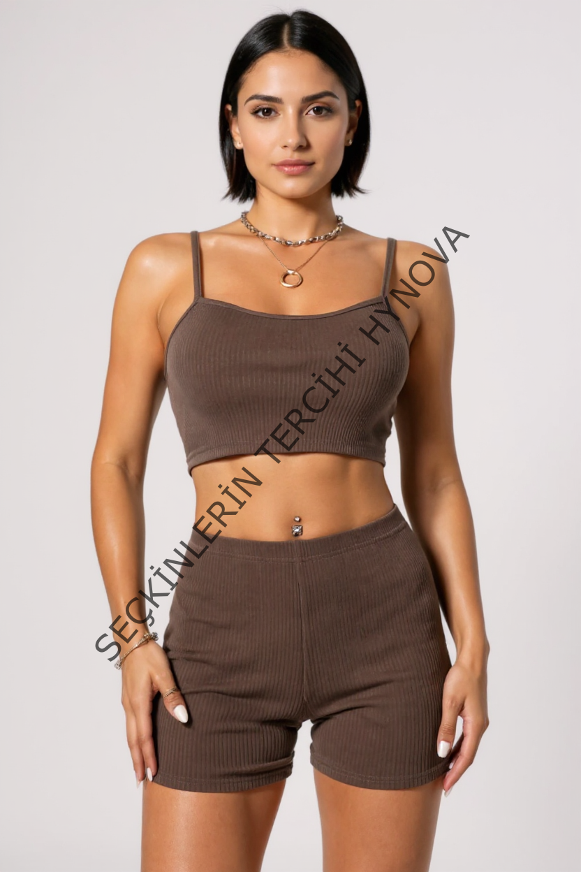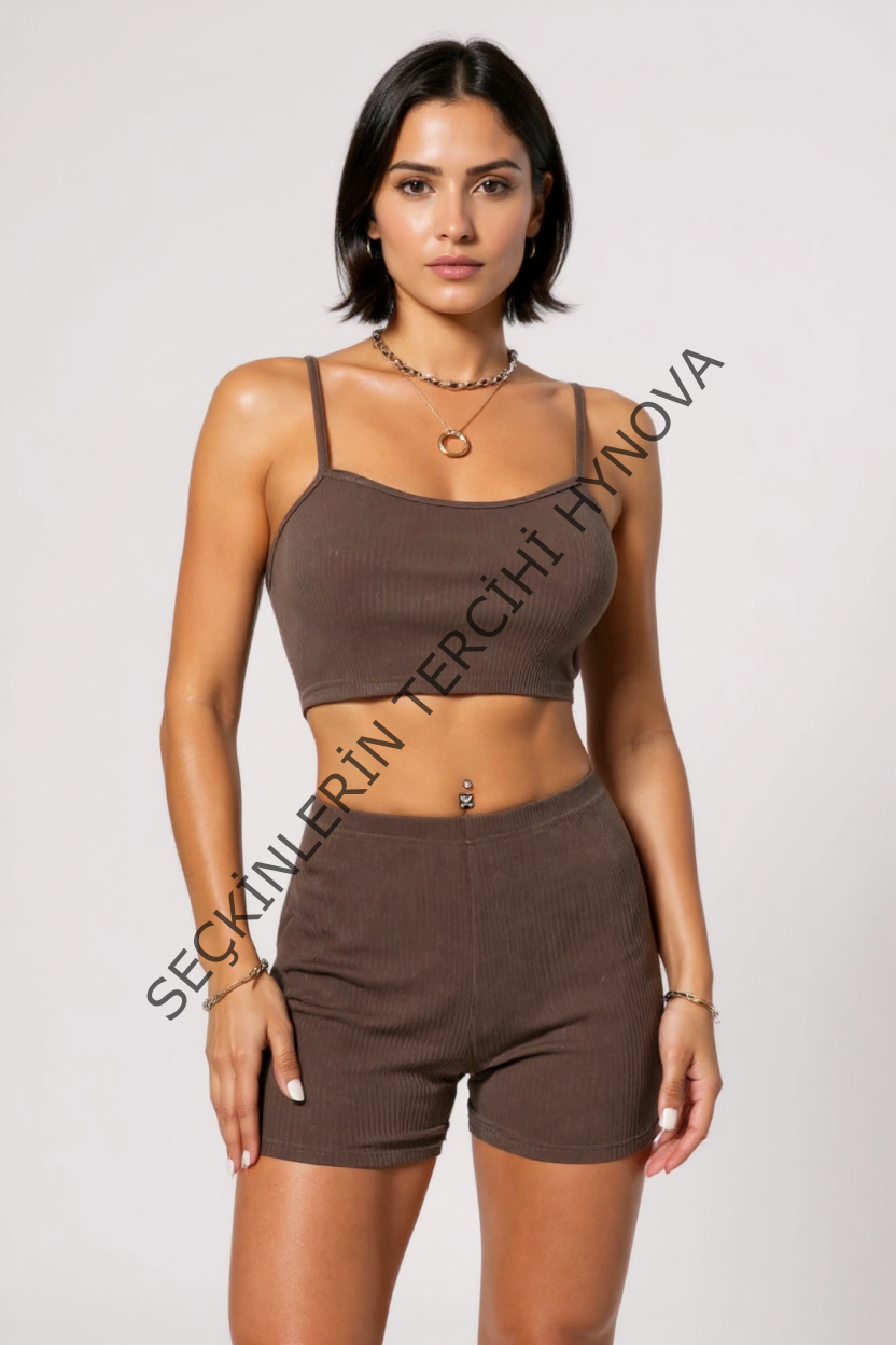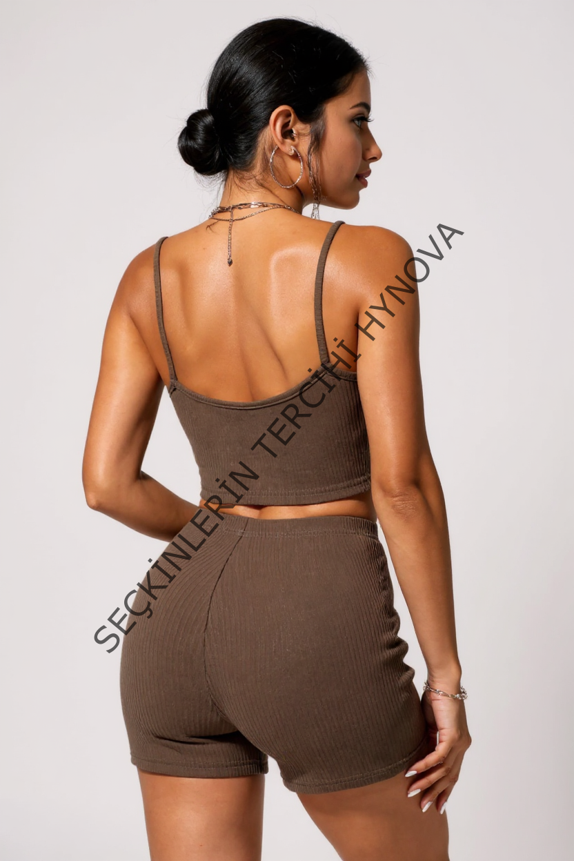Kadın Kahverengi Şortlu Kaşkorse Gecelik Takım – Modern, Konforlu ve Günlük Kombinlere Uygun
