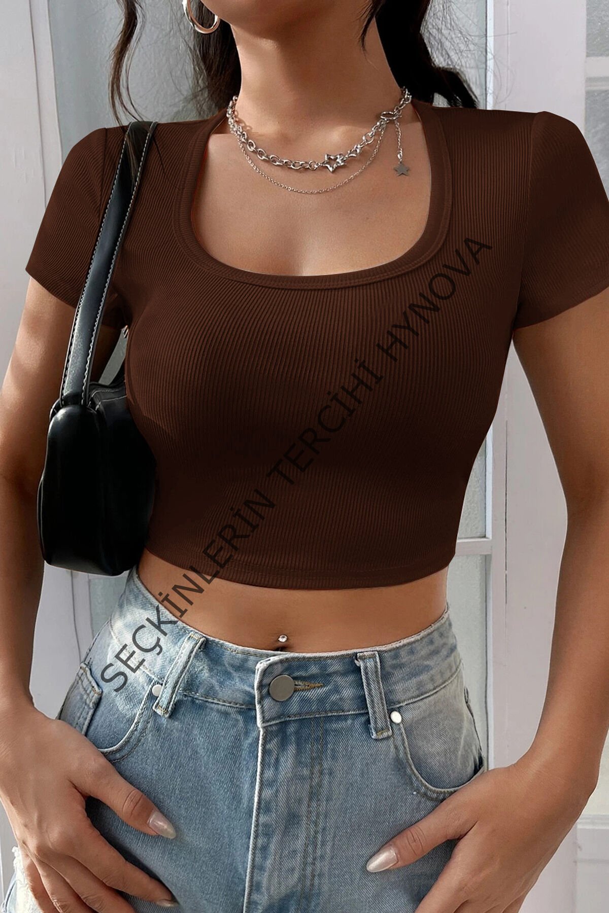 Kadın Kahverengi Yarım Kol Düz Yaka Crop Top Bluz – Şık, Rahat ve Kolay Kombinlenebilir