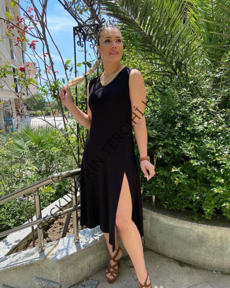 Kadın Kalın Askılı V Yaka Yırtmaç Detay Viskon Elbise