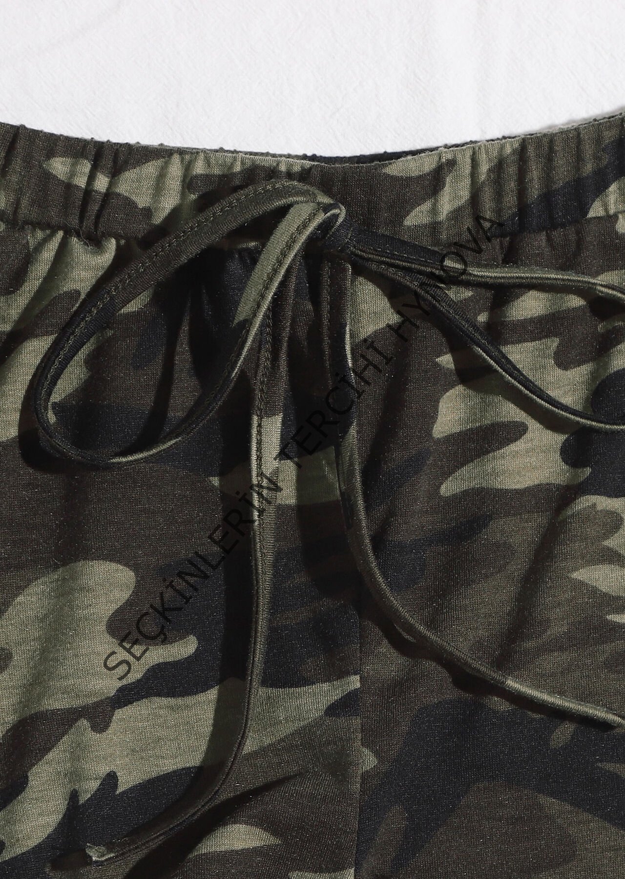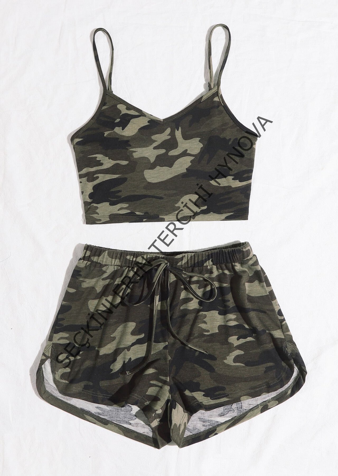 - Askılı Crop ve Şortlu Kamuflaj Desenli Gecelik Takım