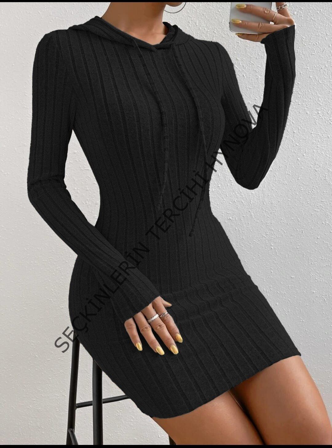 Kadın Kapşonlu Likralı Kaşkorse Mini Elbise