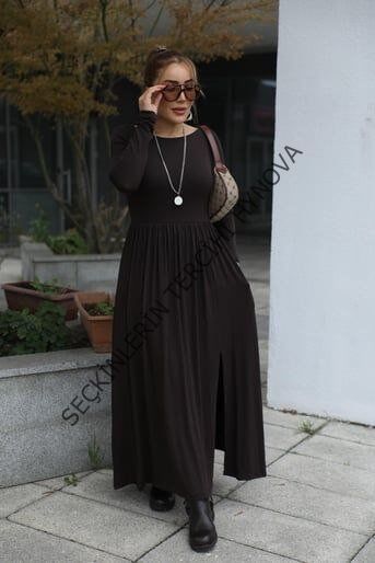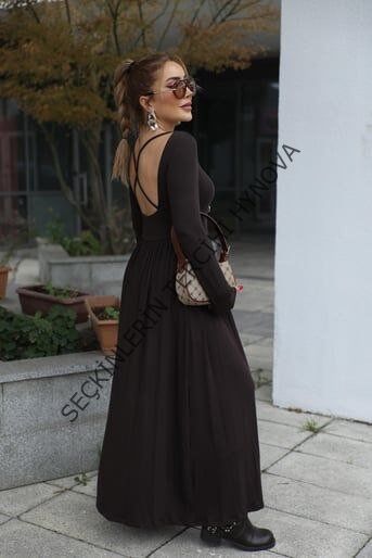 Kadın Kayık Yaka Sırt Dekoltesi Ve Yırtmaç Detay Maxi Boy Elbise