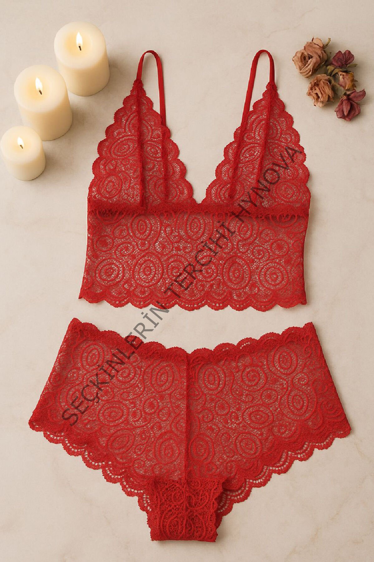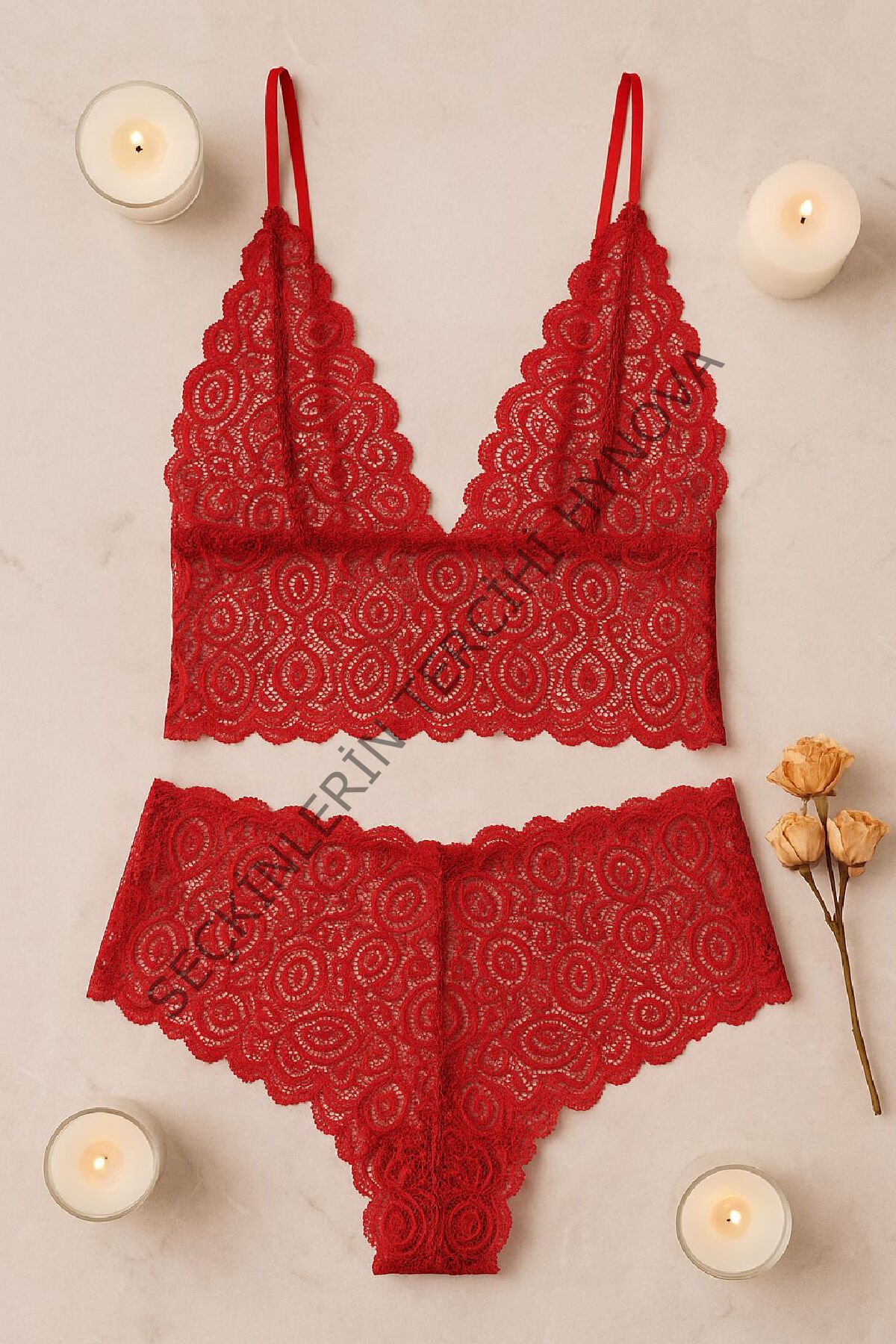 - Tutkunun simgesi olan kırmızı dantel bralet şort takımı, cesur ve feminen bir görünüm isteyenler için özel olarak tasarlandı.