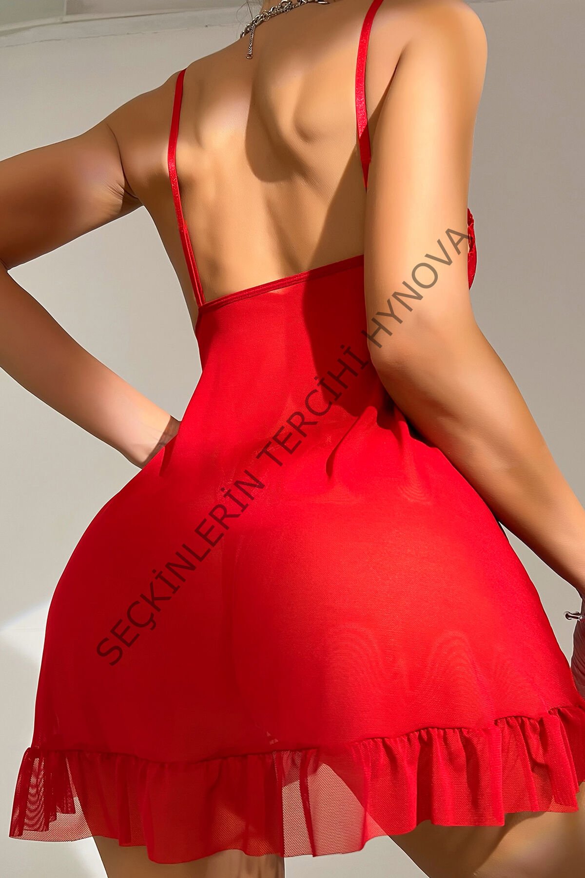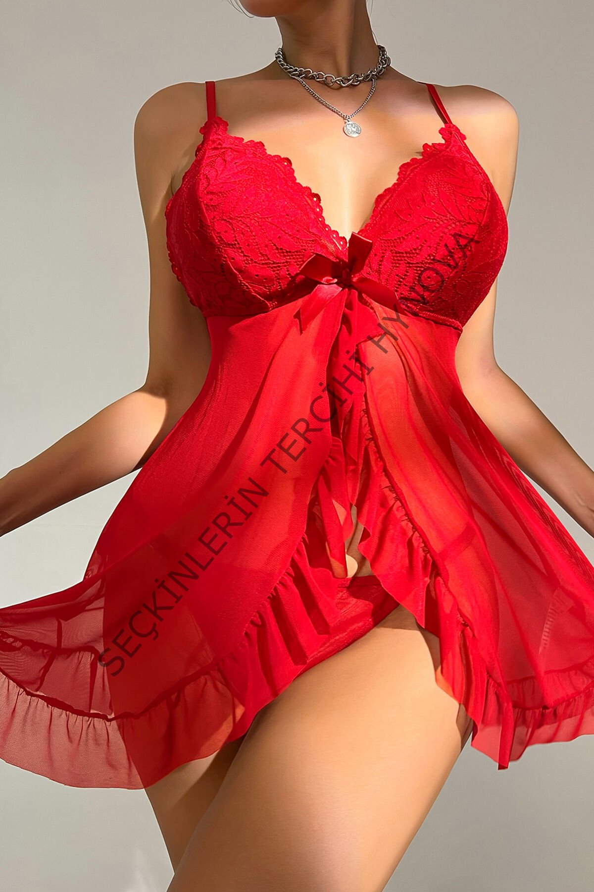 - Kırmızı Dantelli ve Fırfırlı Tül Detaylı Gecelik Takımı