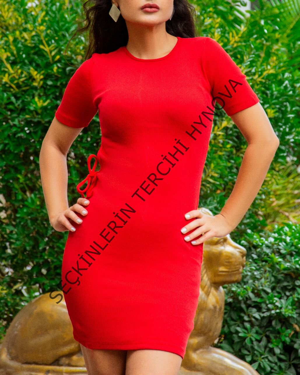 Kadın Kırmızı Kısa Kol Bel Detay Kaşkorse Elbise