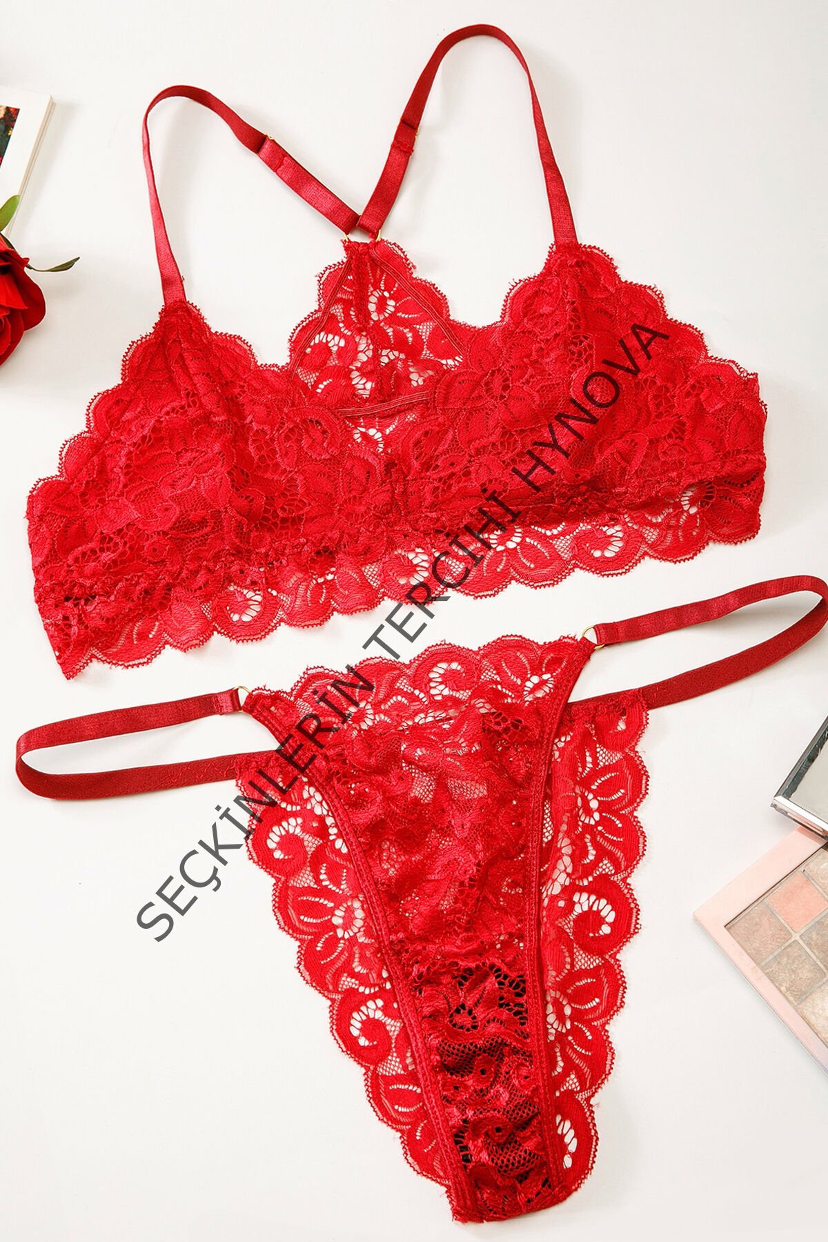 Kadın Kırmızı Sırtı Dantel ve İp Detaylı Şık Sütyen Külot Takımı – Modern, Konforlu ve Günlük Kombinlere Uygun