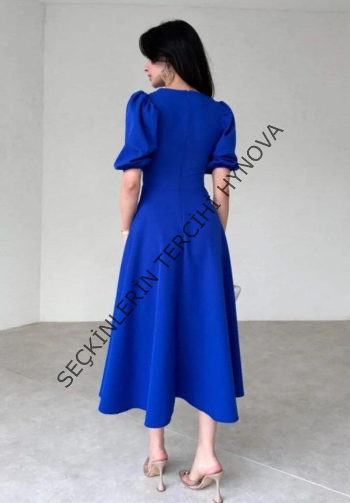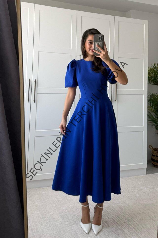 Kadın Kısa Balon Kollu Bisiklet Yaka Geniş Kesim Janjan Krep Elbise