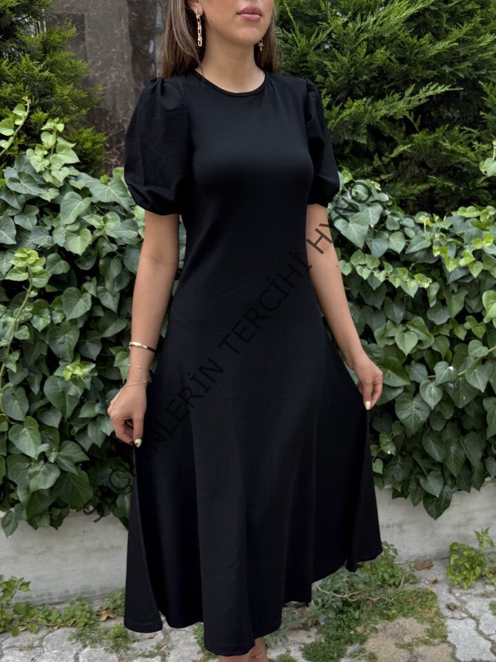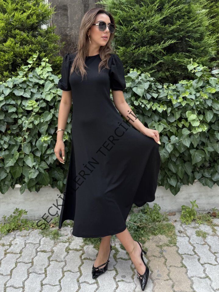 Kadın Kısa Balon Kollu Bisiklet Yaka Geniş Kesim Janjan Krep Elbise