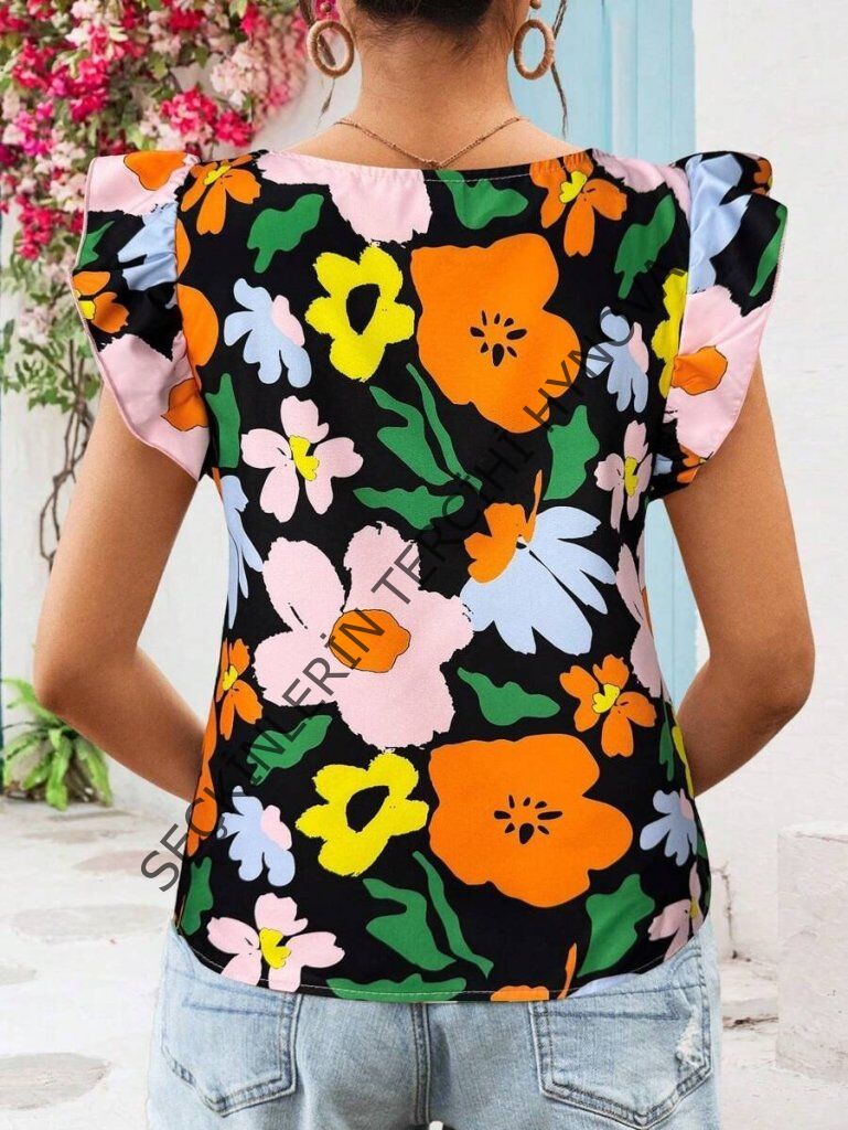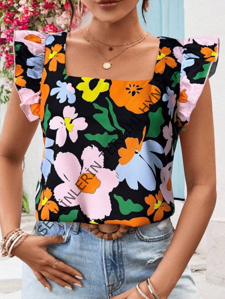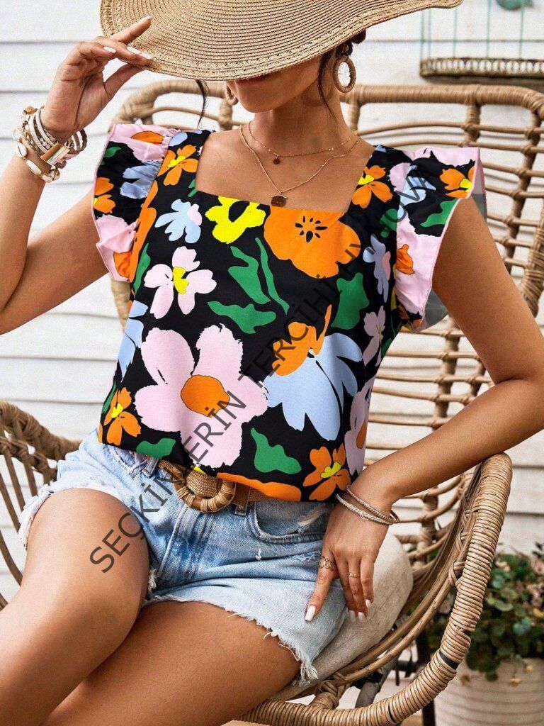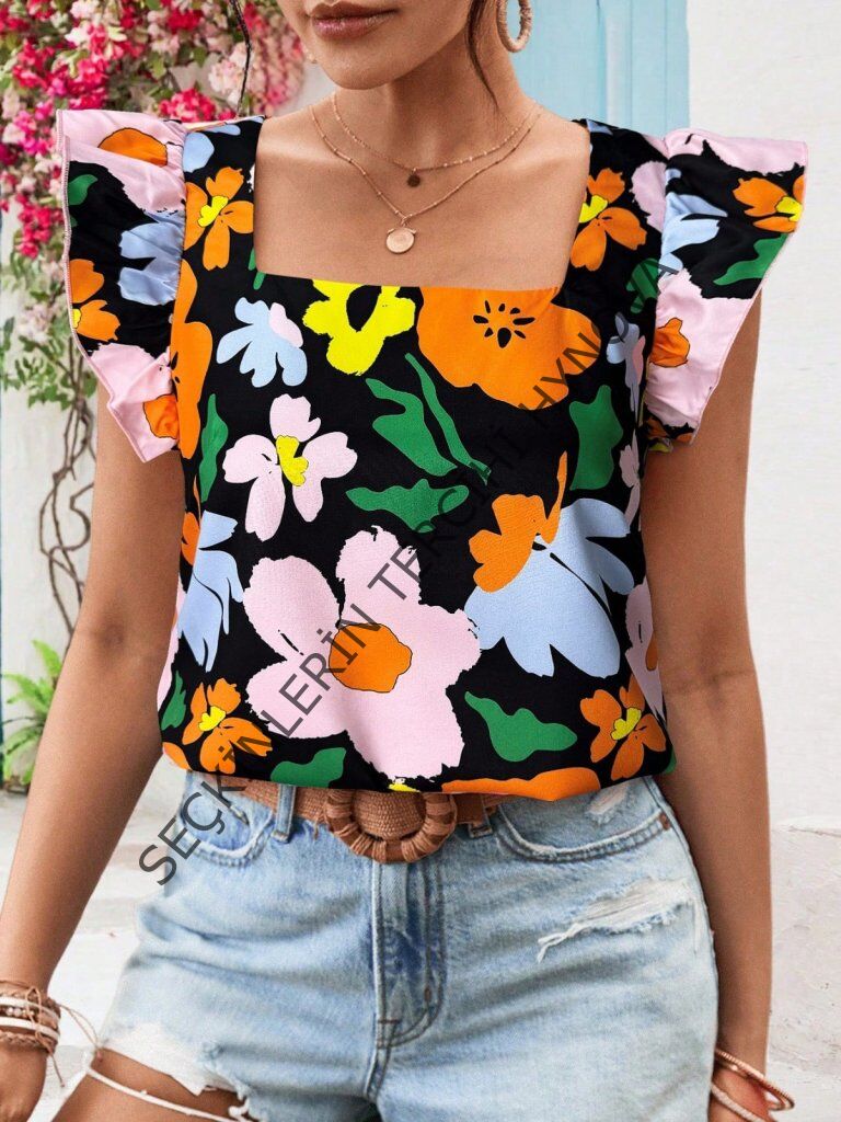 Kadın Kısa Fırfır Kollu Kare Yaka çiçek Desenli Ithal Keten Bluz