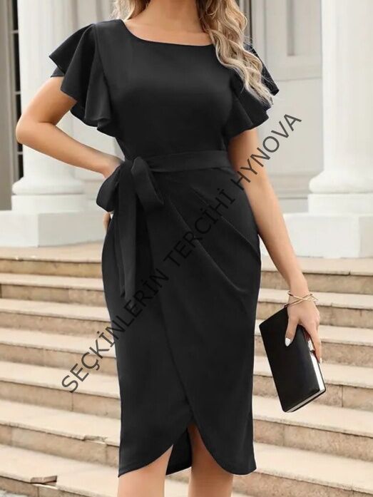 Kadın Kısa Fırfır Kollu Yakası Açık Belden Kuşaklı çapraz Kesim Detaylı Ithal Krep Elbise