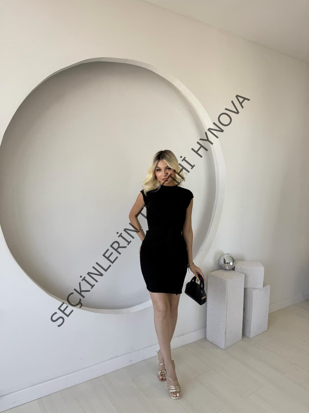 Kadın Kısa Kap Kollu Bisiklet Yaka Belden Bağlamalı Modal Mini Elbise