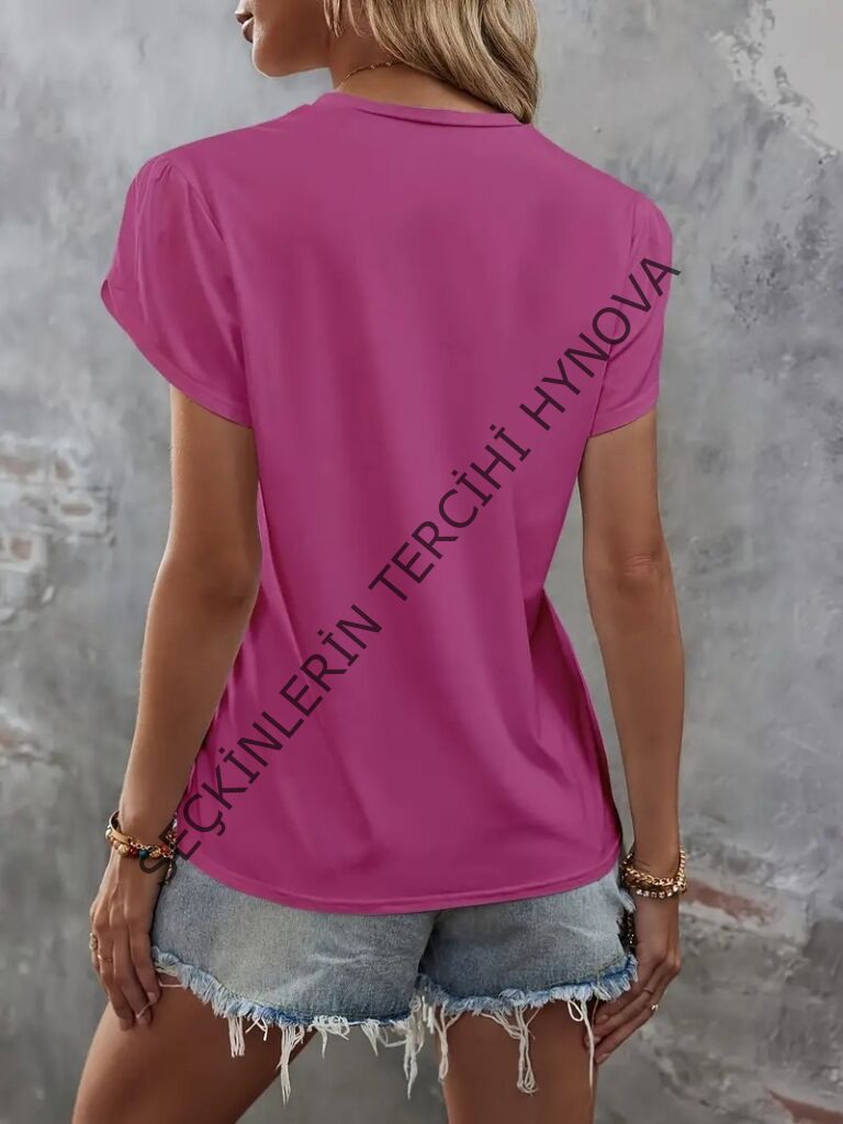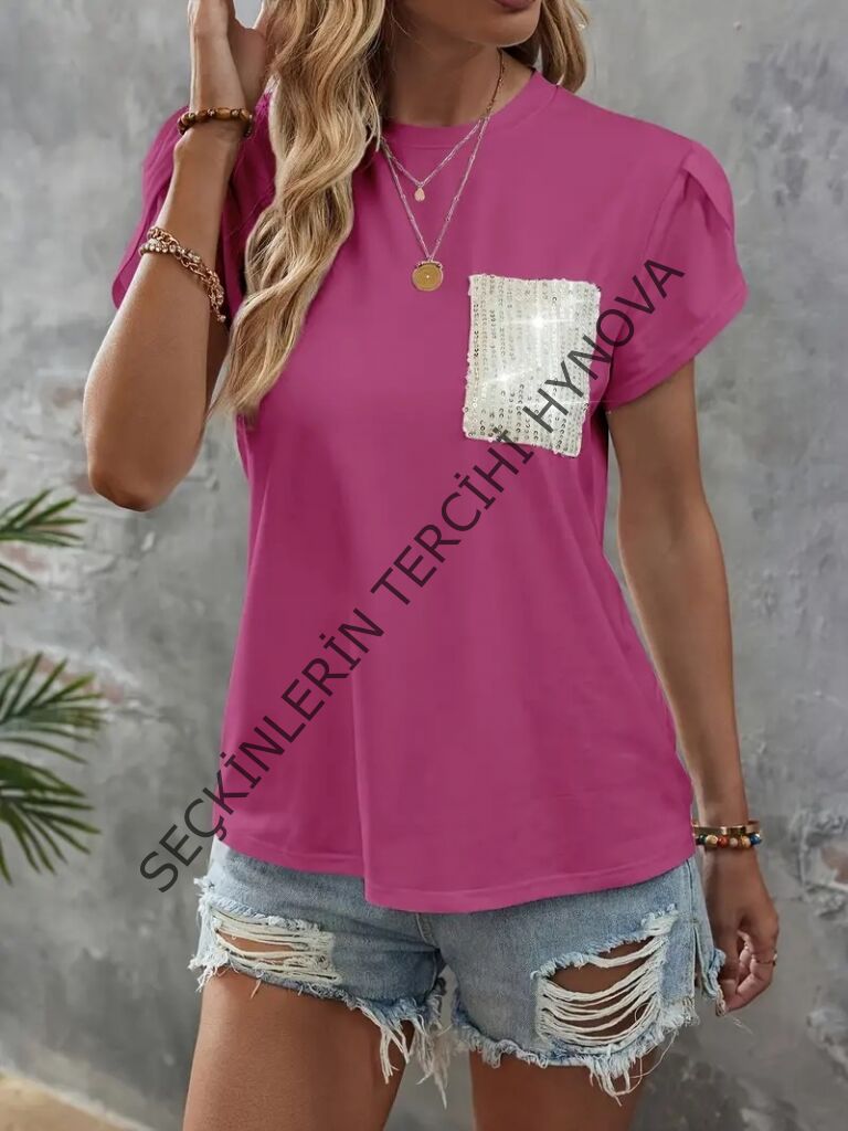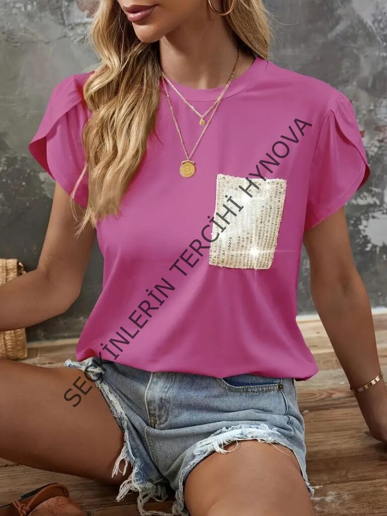 Kadın Kısa Kollu Bisiklet Yaka Cep Pul Payet Detay Viskon Bluz