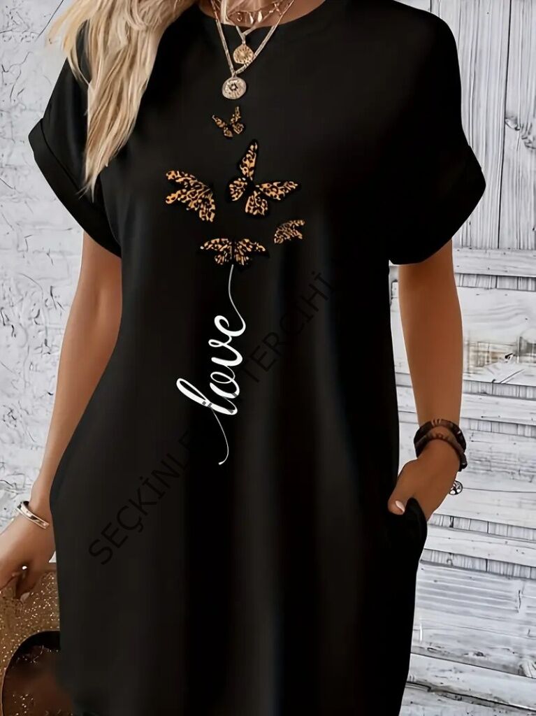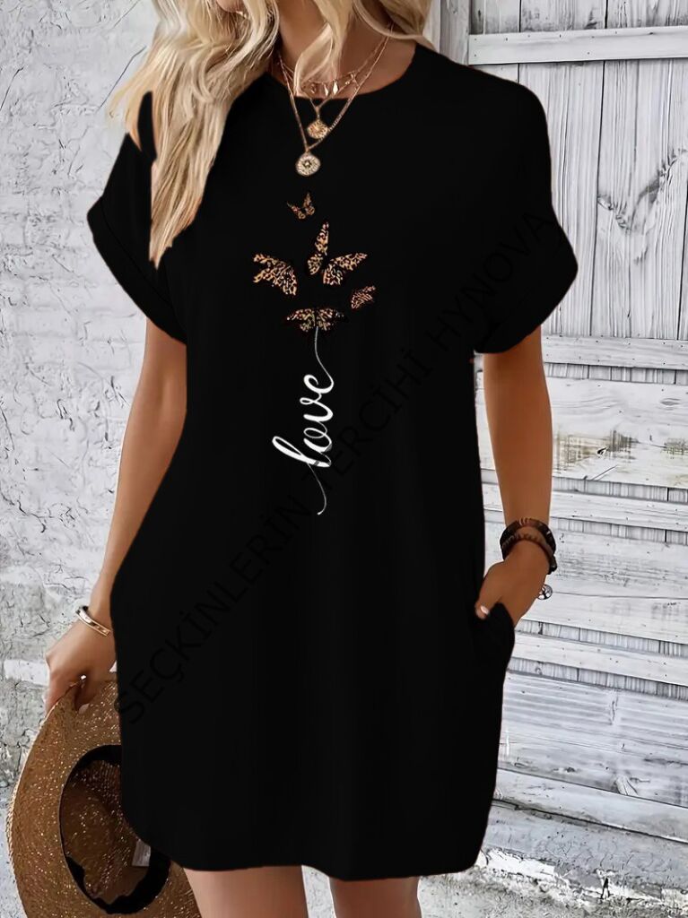 Kadın Kısa Kollu Bisiklet Yaka Cepli Kelebek Baskılı Viskon Elbise