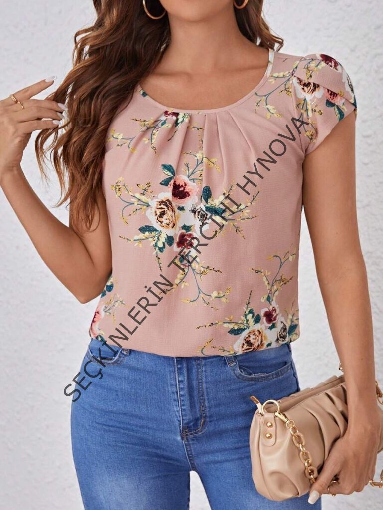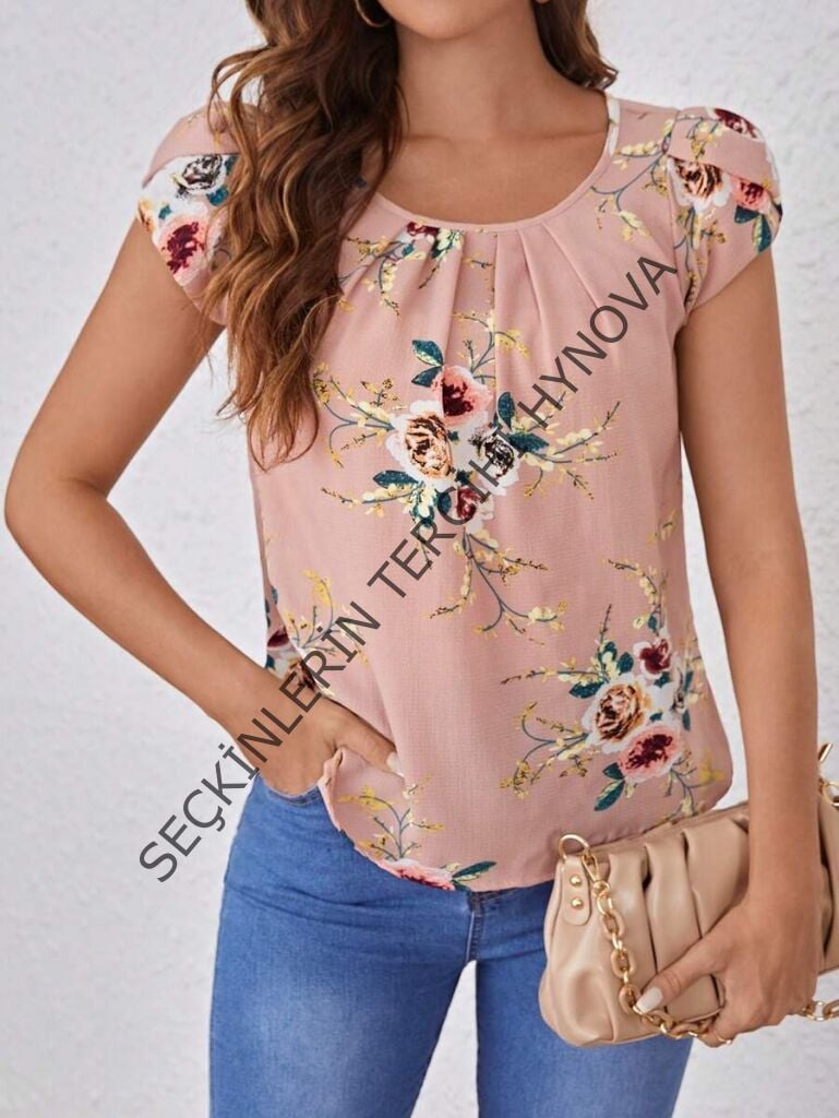 Kadın Kısa Kollu Bisiklet Yaka çiçek Baskılı Süprem Bluz