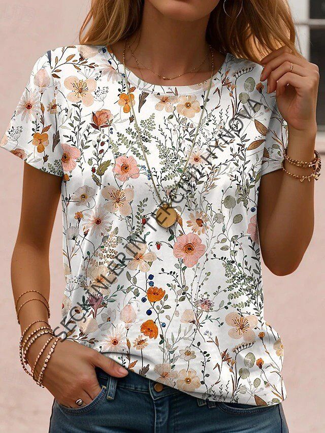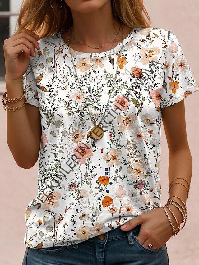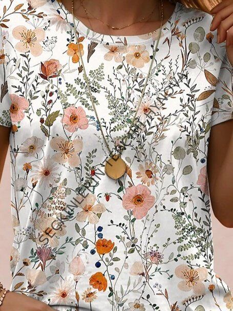 Kadın Kısa Kollu Bisiklet Yaka çiçek Desenli Viskon Bluz