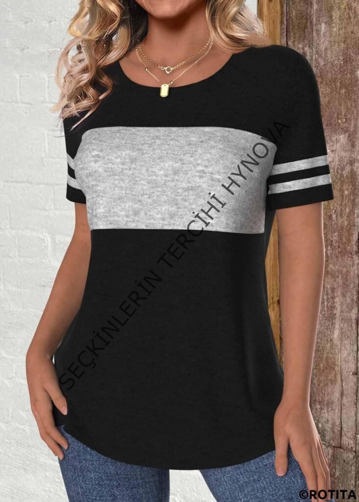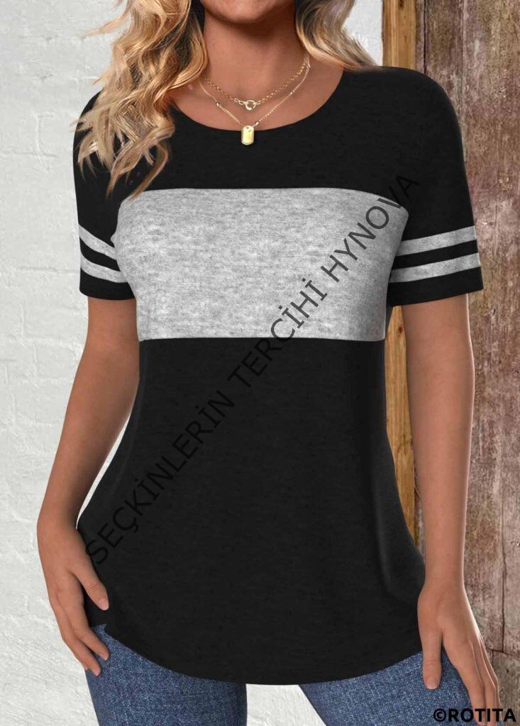 Kadın Kısa Kollu Bisiklet Yaka çift Renkli Viskon Bluz