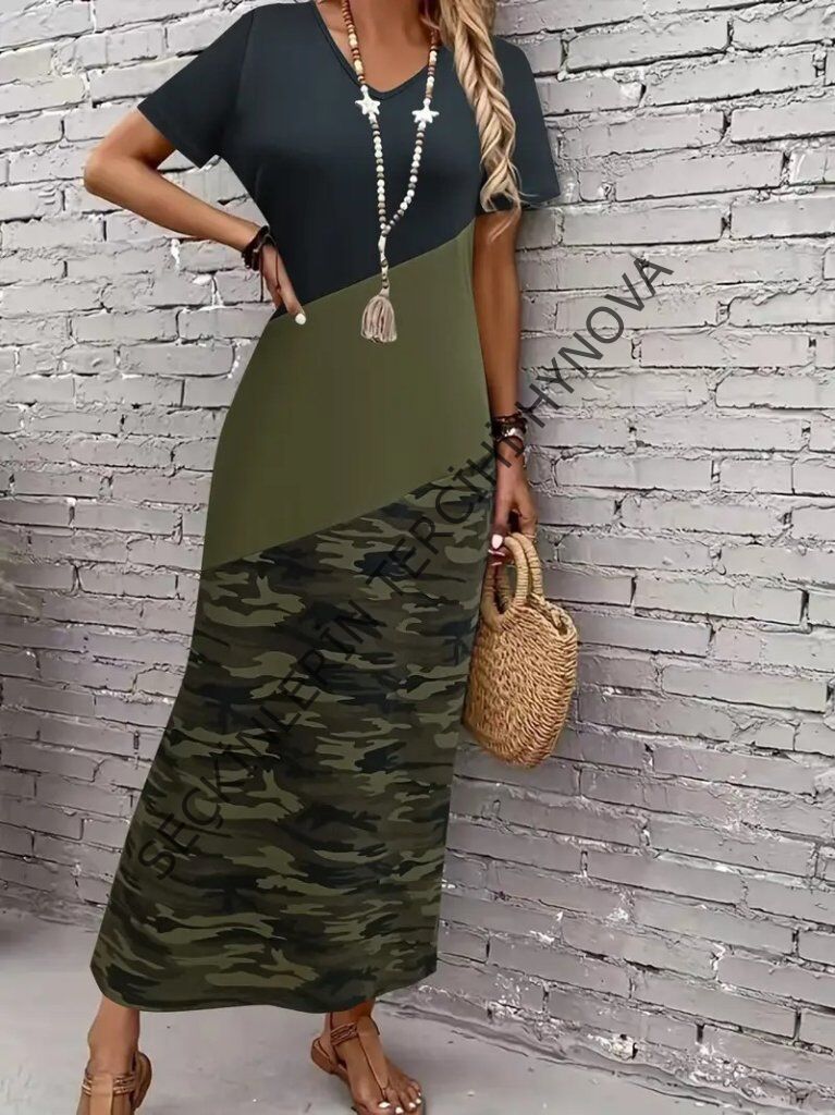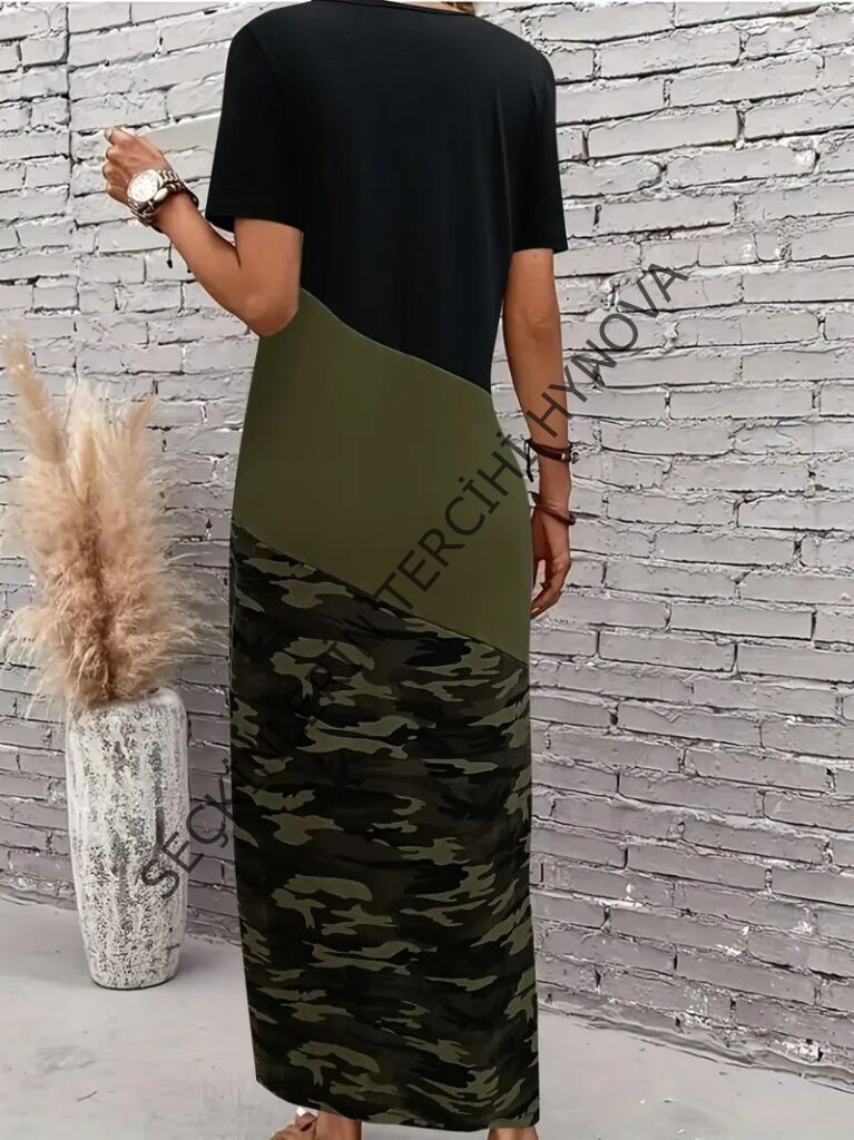 Kadın Kısa Kollu Bisiklet Yaka çok Renkli Maksi Viskon Elbise