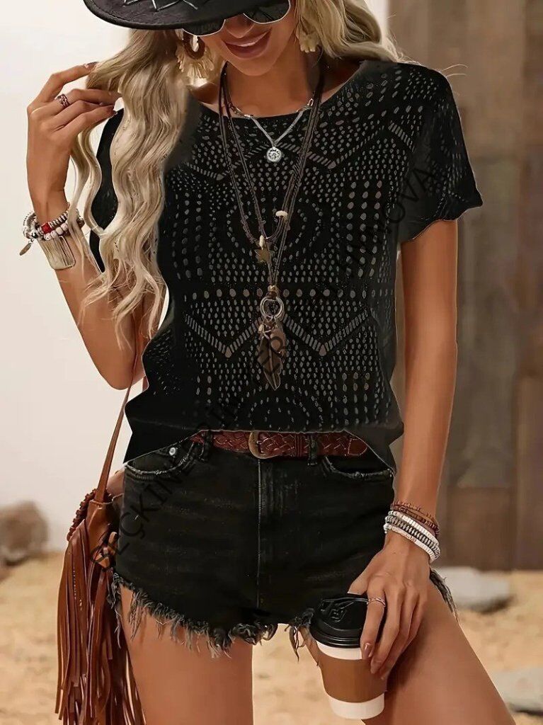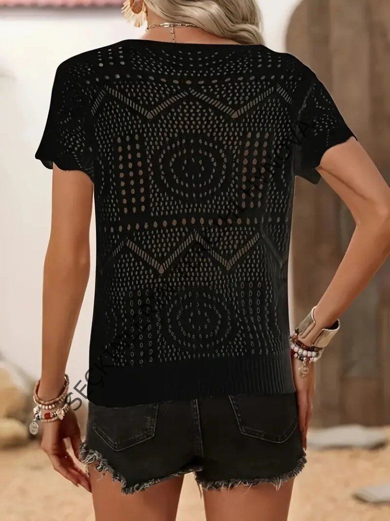 Kadın Kısa Kollu Bisiklet Yaka Desenli Triko Bluz