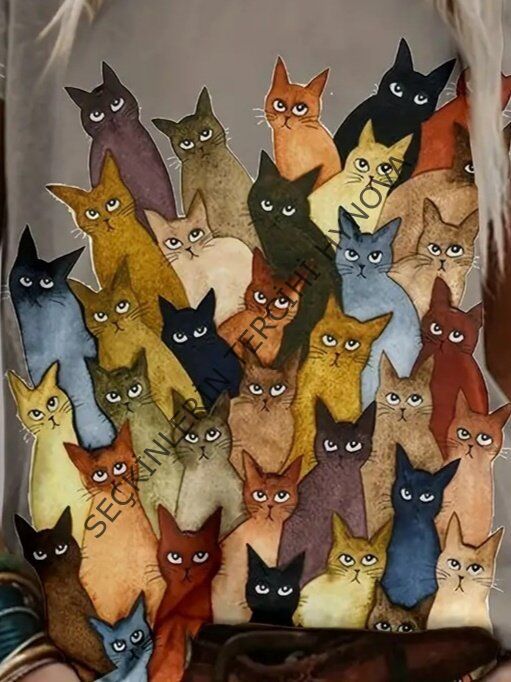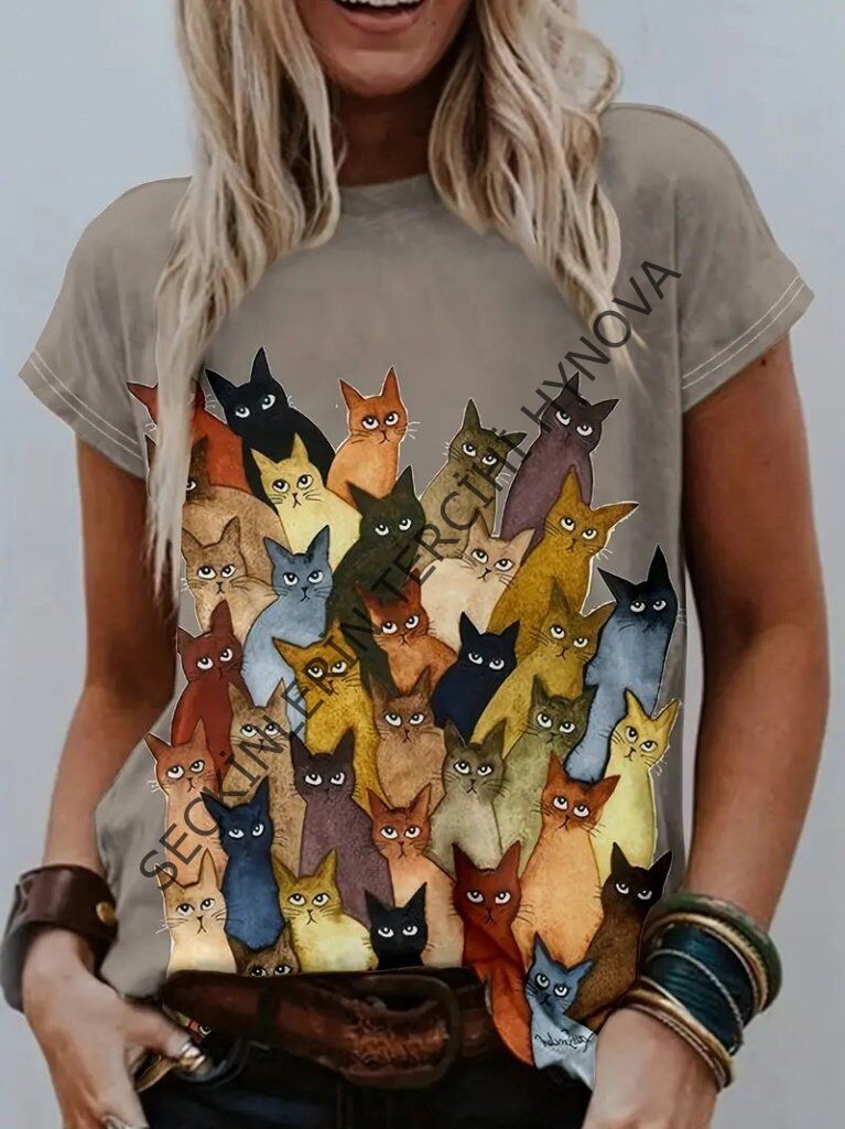 Kadın Kısa Kollu Bisiklet Yaka Kedi Desenli Süprem Bluz