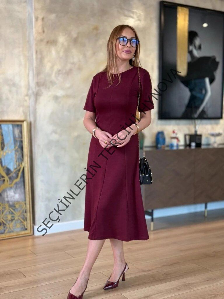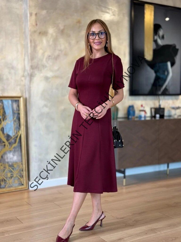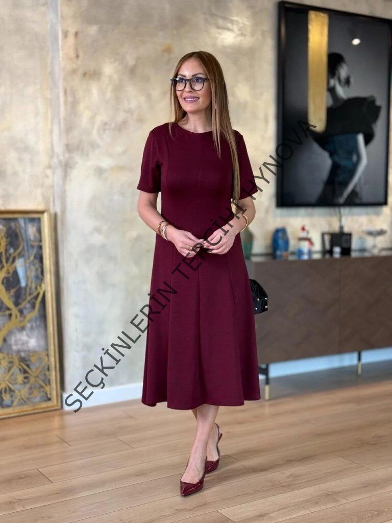 Kadın Kısa Kollu Bisiklet Yaka Midi Viskon Iki Iplik Elbise