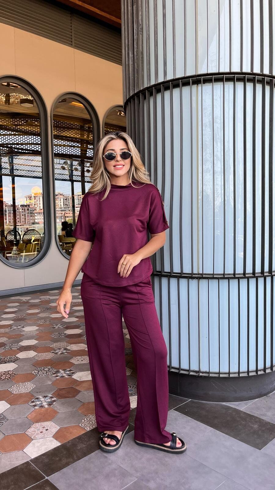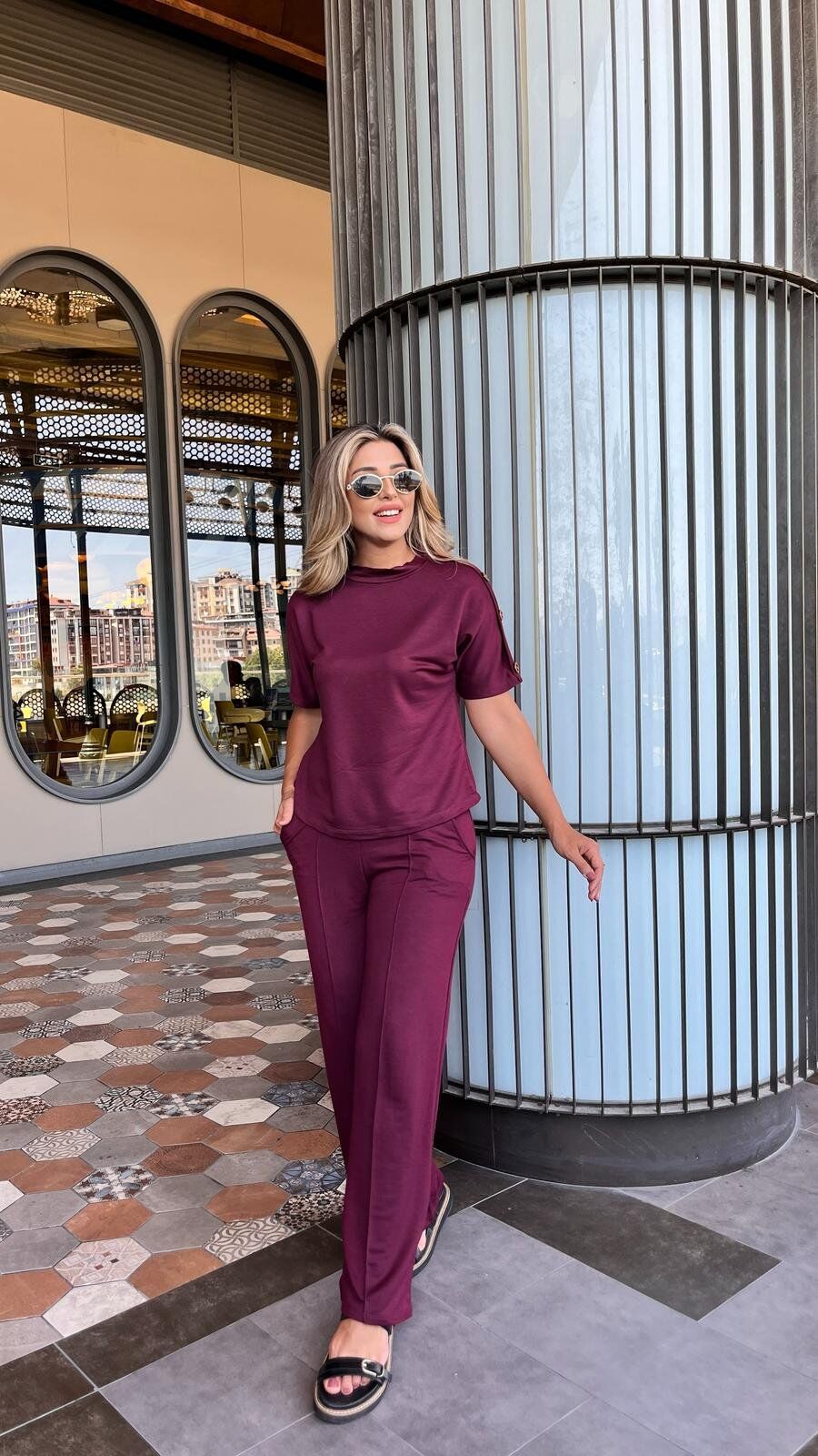 Kadın Kısa Kollu Bisiklet Yaka Omuzdan Düğmeli Viskon Iki Iplik Kısa Bluz Ve Pantolon Ikili Takım