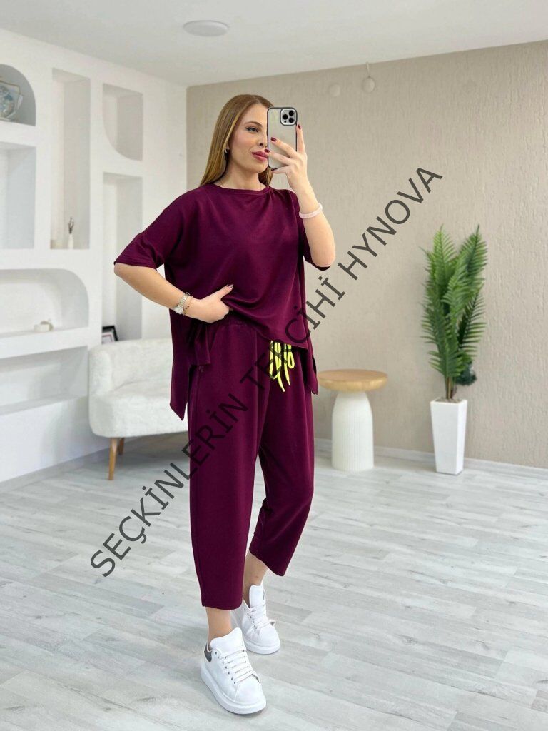 Kadın Kısa Kollu Bisiklet Yaka Viskon Iki Iplik Bluz Ve Pantolon Ikili Takım